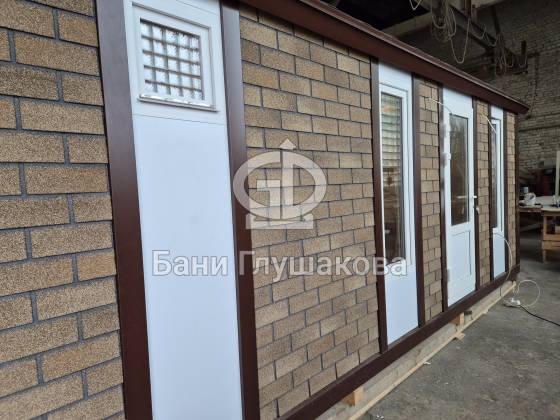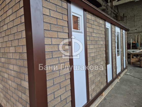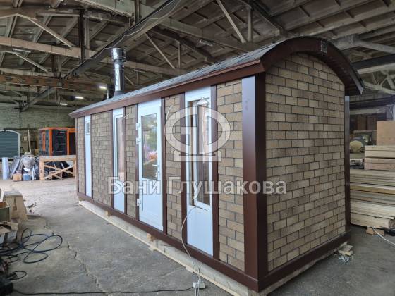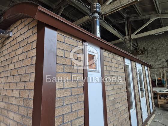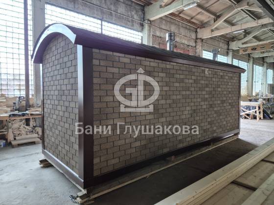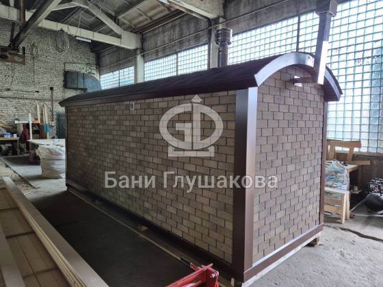 Мы построили необычную перевозную баню 6 метров — «Буханочку», отделанную фасадными панелями Технониколь Hauberk под кирпич. Это решение даёт ей важные преимущества перед традиционными каркасными банями с деревянной наружной отделкой:
