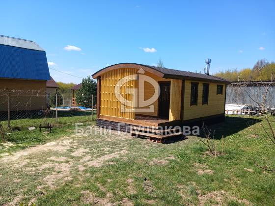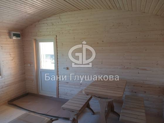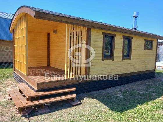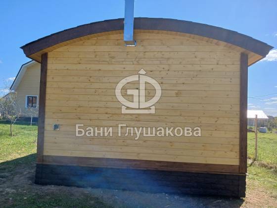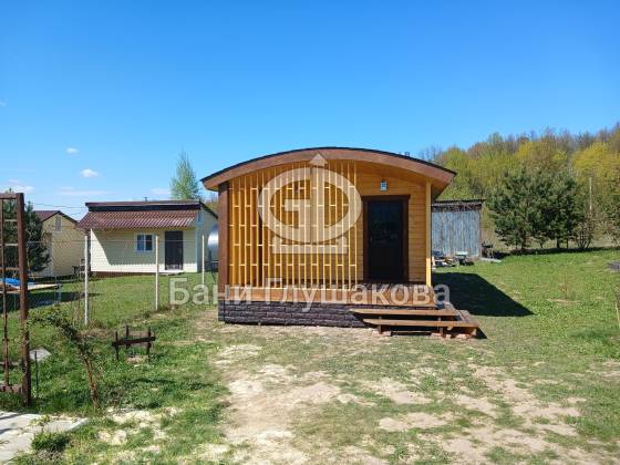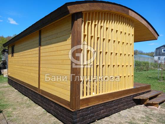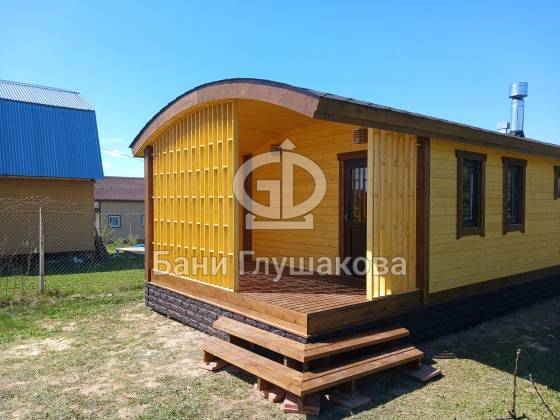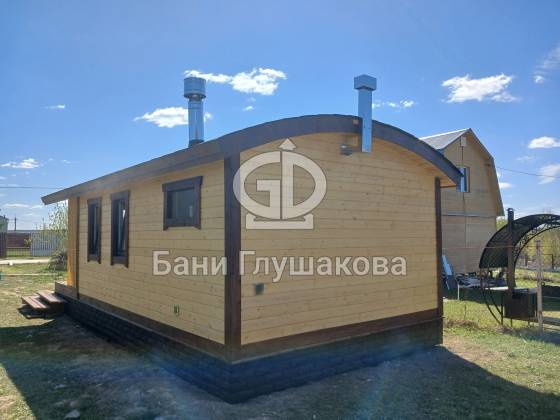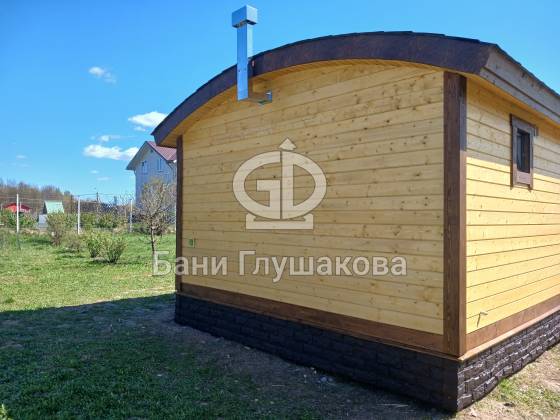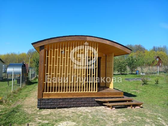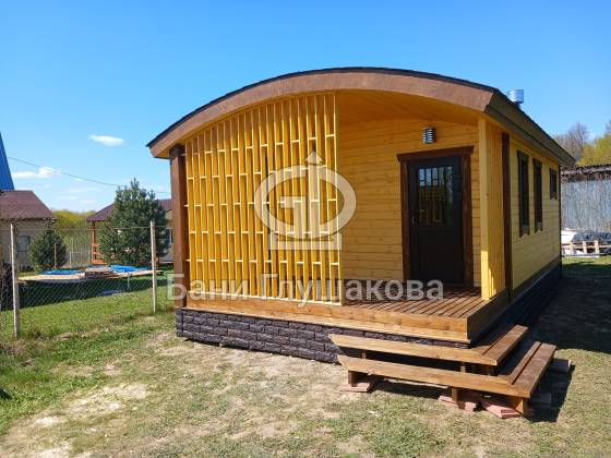 Внешний вид бани подчёркивает фирменная округлая крыша — эффектная, необычная и идеально вписывающаяся в концепцию загородного уюта. Для гармонии образа цоколь обшит декоративным кирпичом в тон наличников, а угловое крыльцо делает вход особенно выразительным.