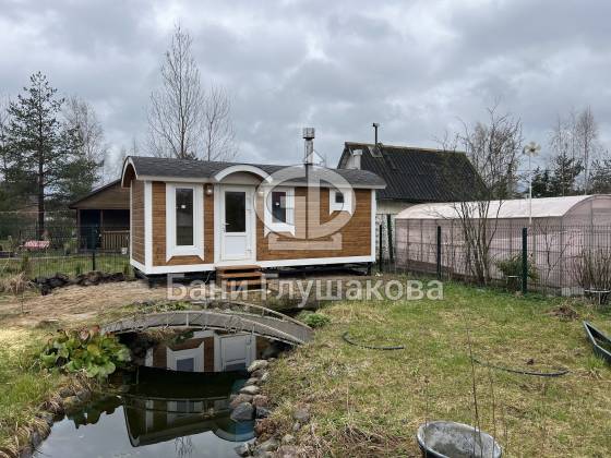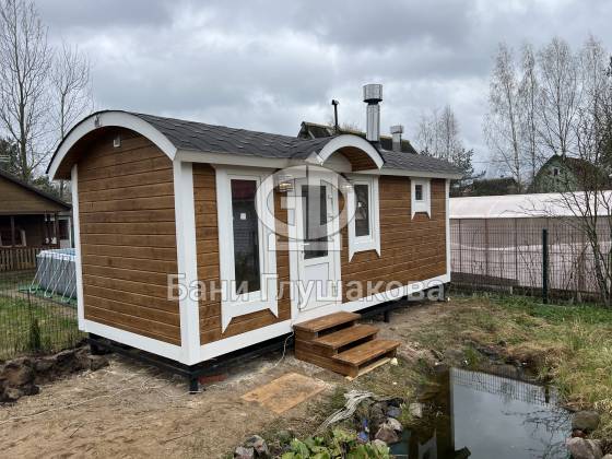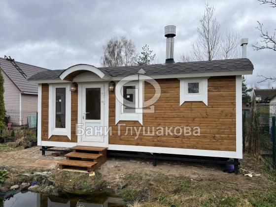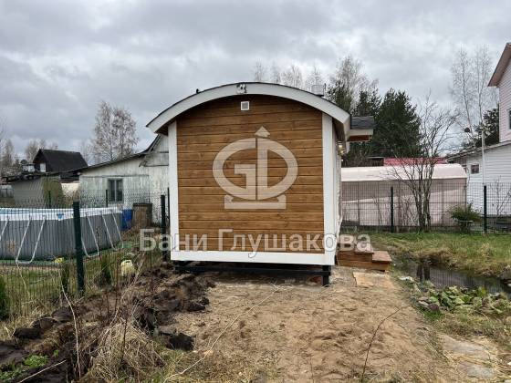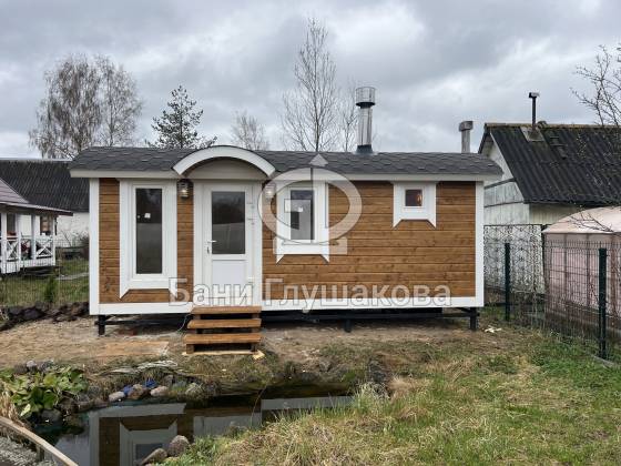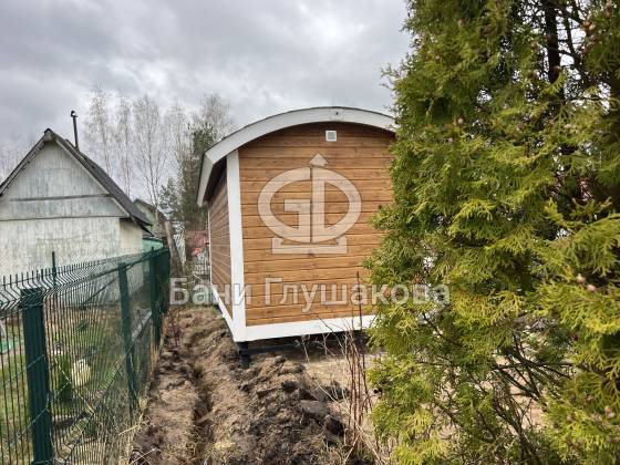 Баня «Буханочка» с округлым козырьком на ухоженном участке