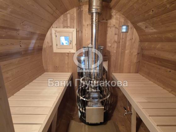 Баня быстро прогревается, не требует фундамента и доставляется в готовом виде.