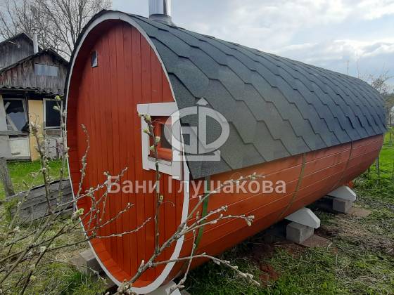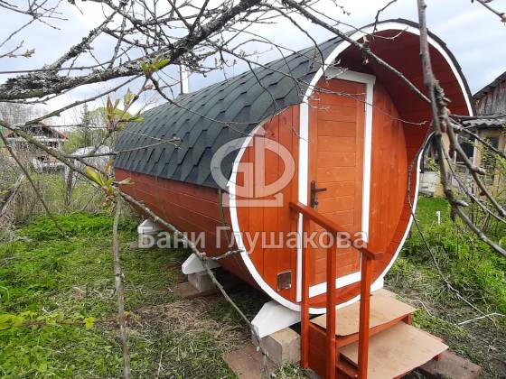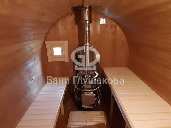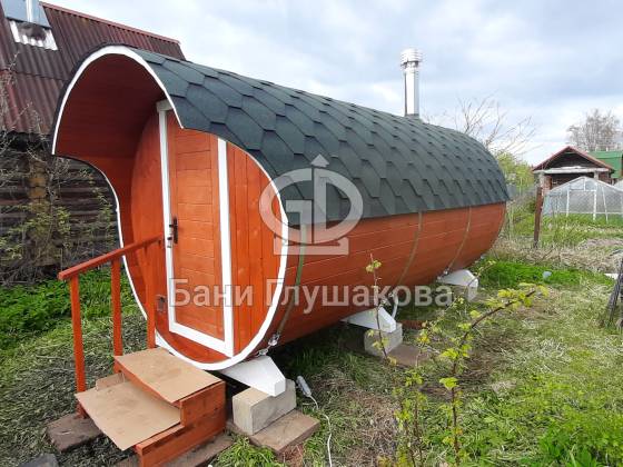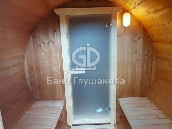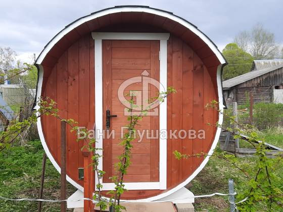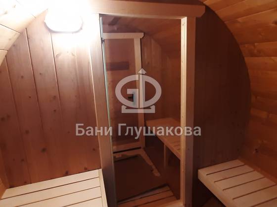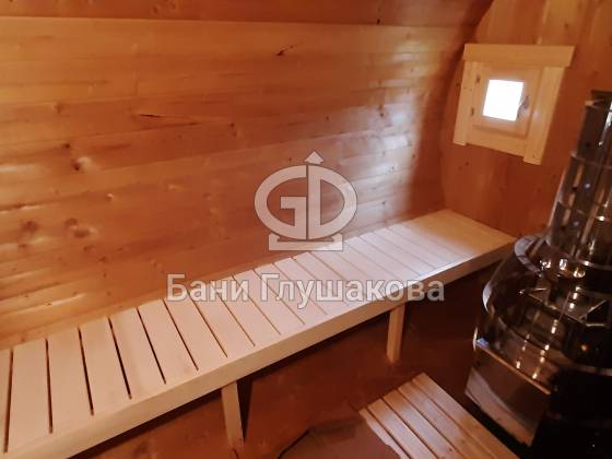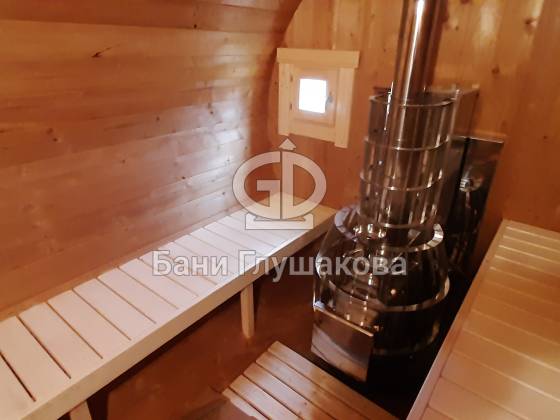 Благодаря форме бочки баня быстро прогревается, а термодерево обеспечивает стабильность геометрии, не боится влаги и не рассыхается.