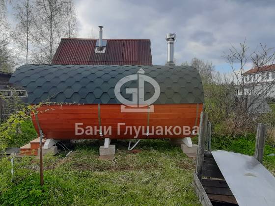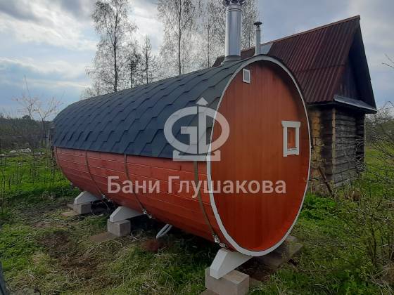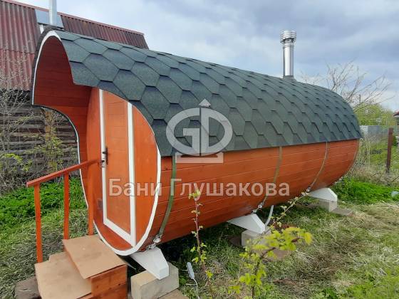 Построили баню-бочку длиной 4 метра и шириной 2,1 метра из термодерева. Компактный, но продуманный вариант с планировкой: комната отдыха + парная.
