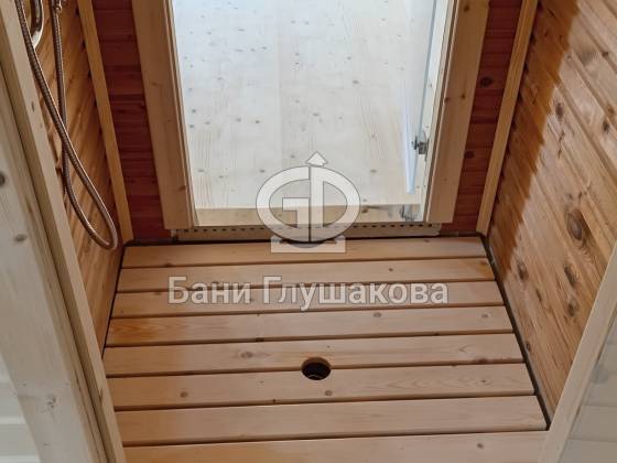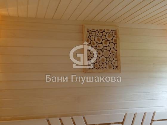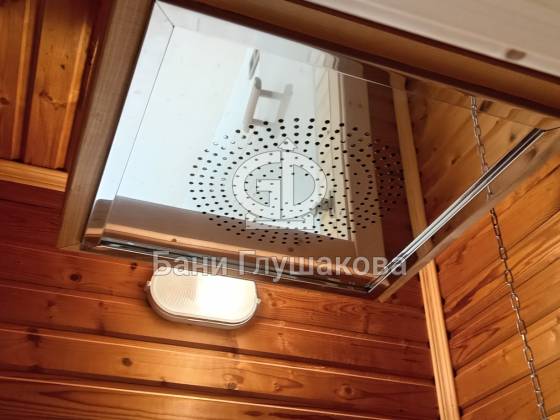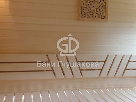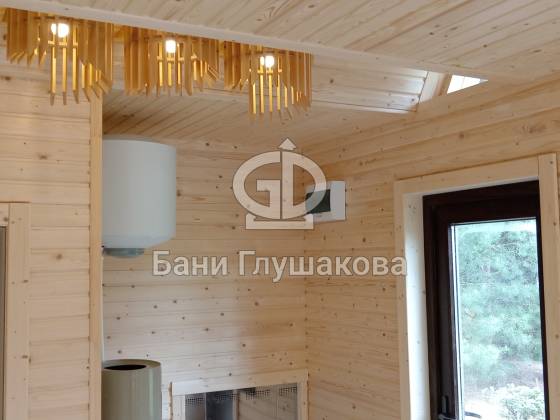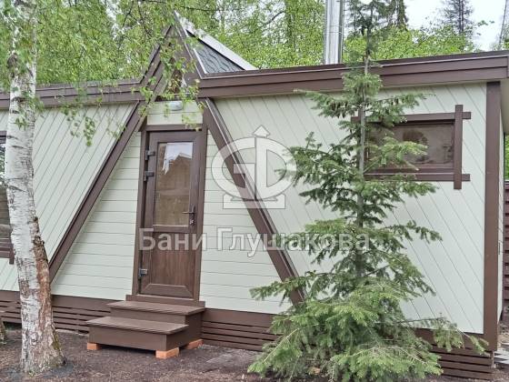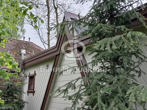 Баня выполнена по каркасной технологии с утеплением 150 мм. Фасад обшит широкой вагонкой в комбинированном стиле: горизонтальные и диагональные линии подчёркивают форму постройки. Кровля — особая гордость проекта: ступенчатые металлические планки не только украшают баню, но и защищают деревянную обшивку от влаги. Скрытые трубы из нержавеющей стали органично вписаны в фасад и обеспечивают надёжный отвод воды.