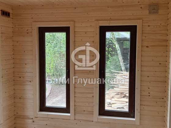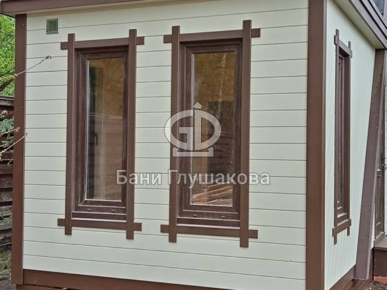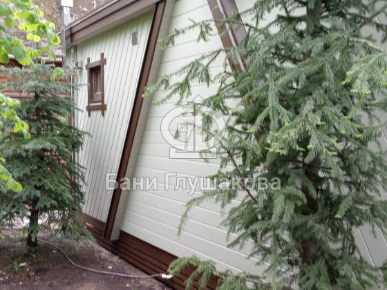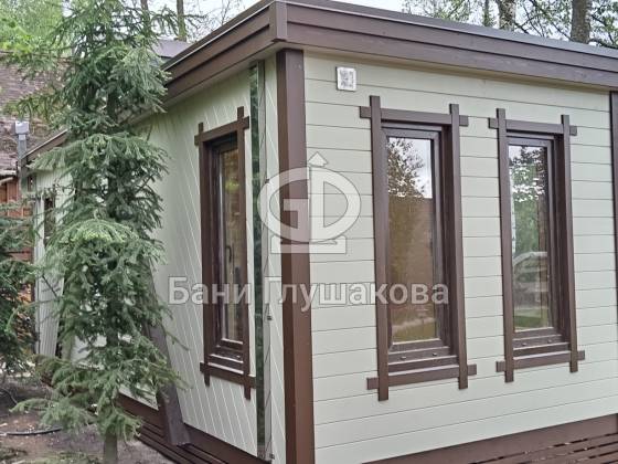 Баня окрашена в элегантный белый цвет с контрастными коричневыми наличниками. Стены — влагостойкая краска Tikkurila Pika-Teho, которая сохраняет цвет и текстуру надолго.
