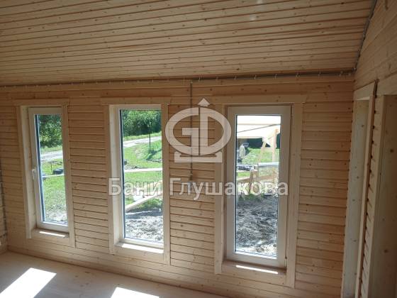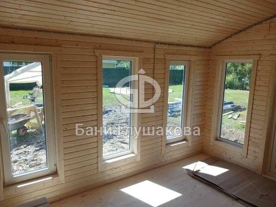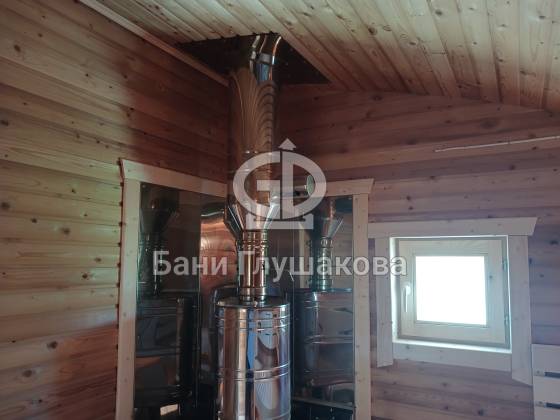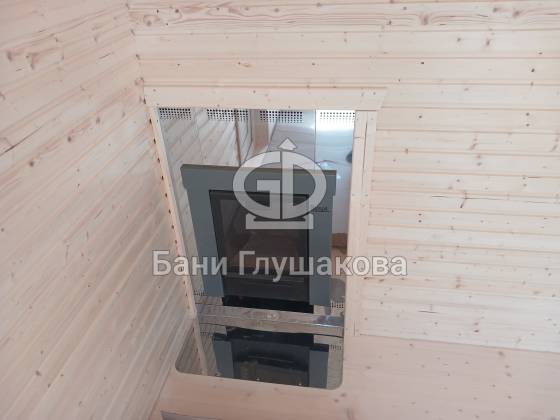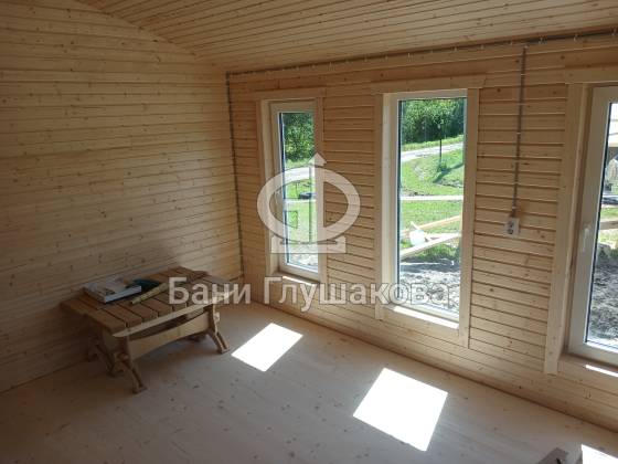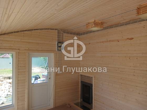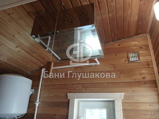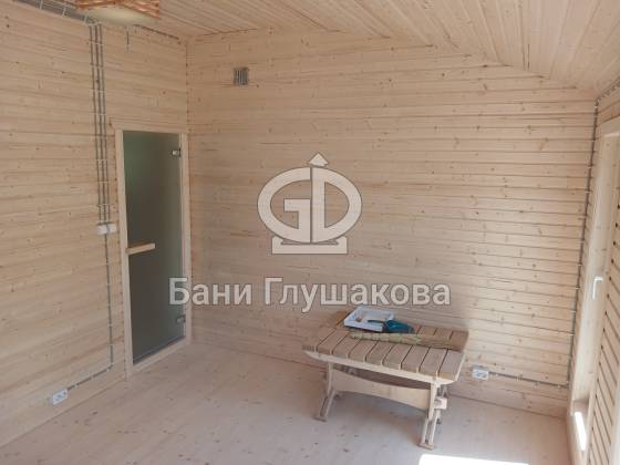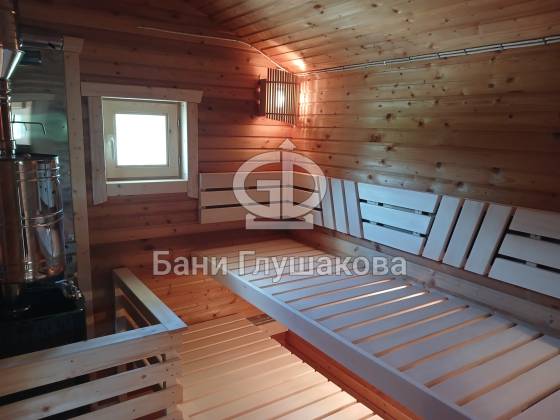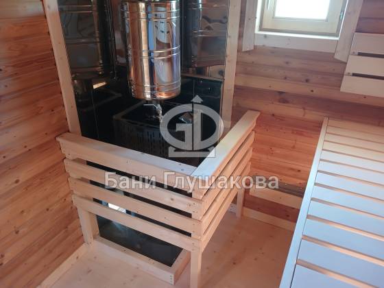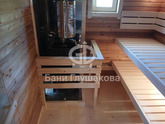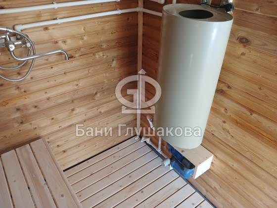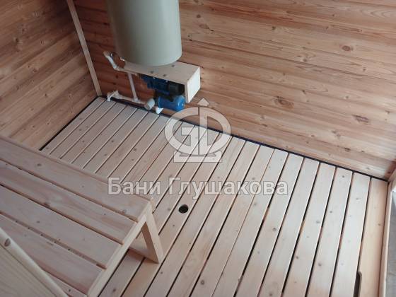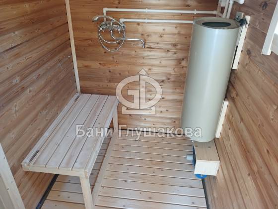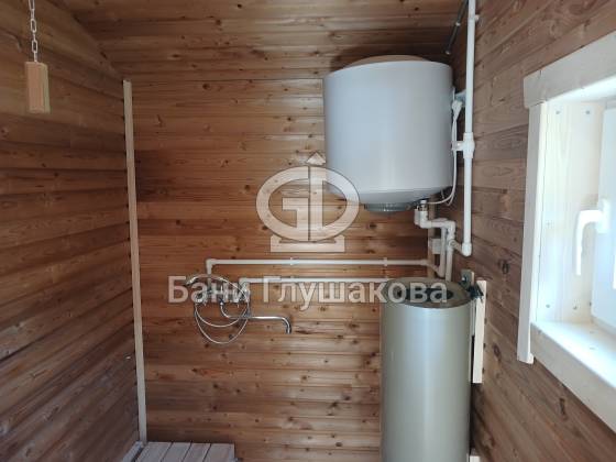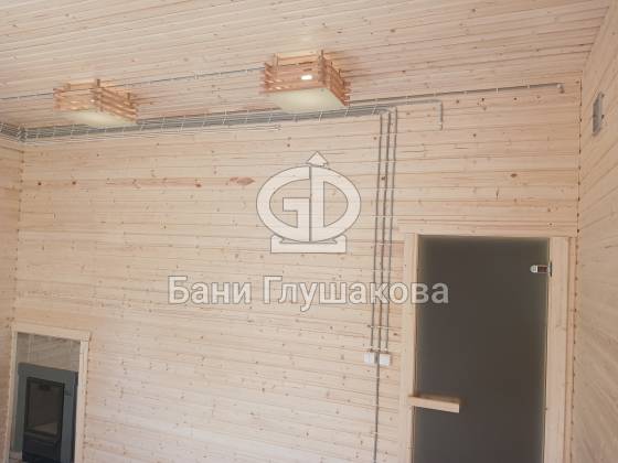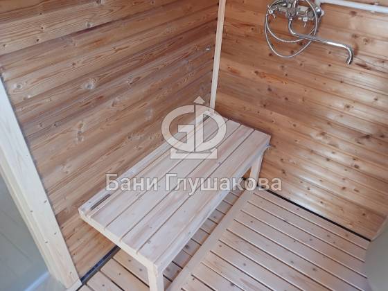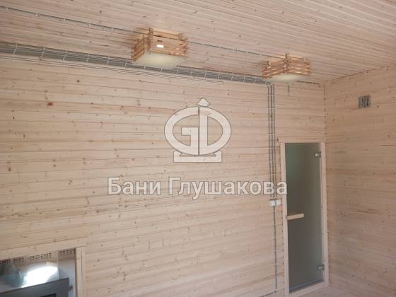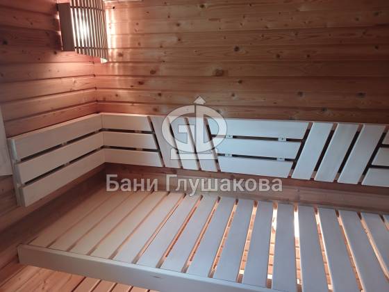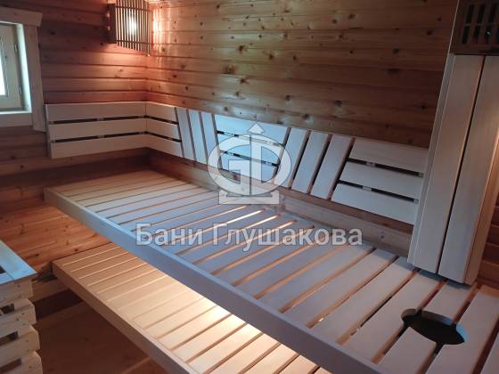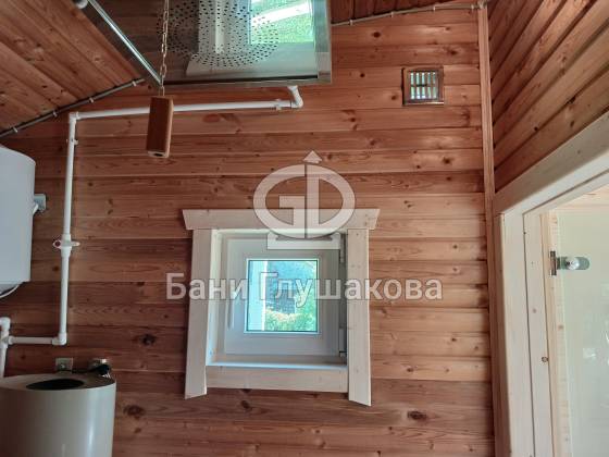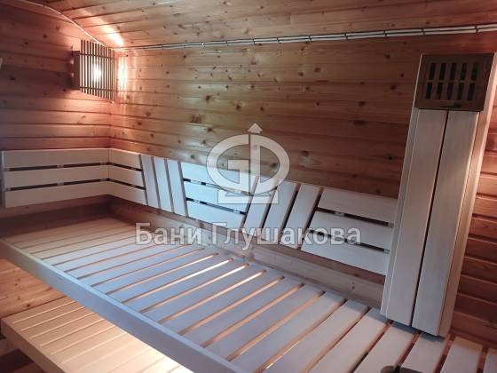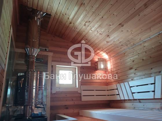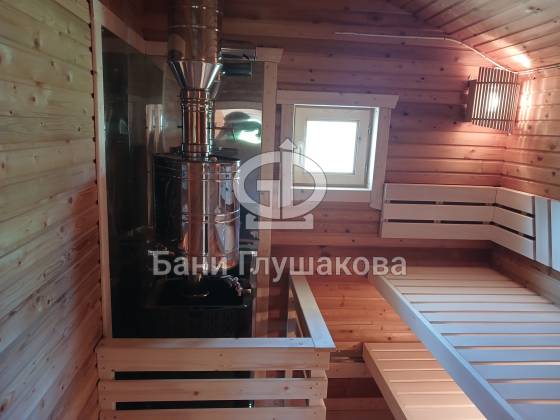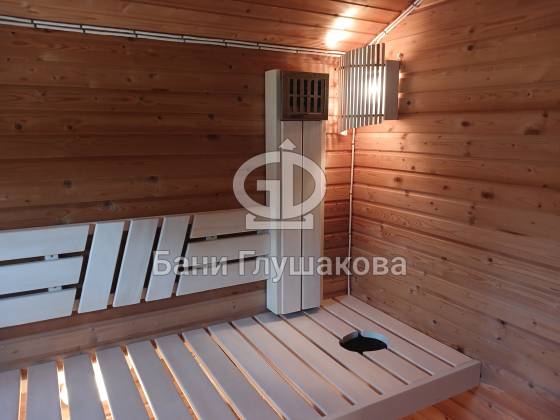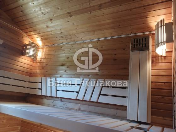 В помывочной отделка из термовагонки, автономный душ, обливное устройство и прочный пластиковый поддон, который защитит баню от влаги даже при частом использовании. В парной — всё, как любят знатоки хорошей сауны: тёплая термовагонка, светлые полки, принудительная вентиляция и система «второе дыхание» для правильного пара.