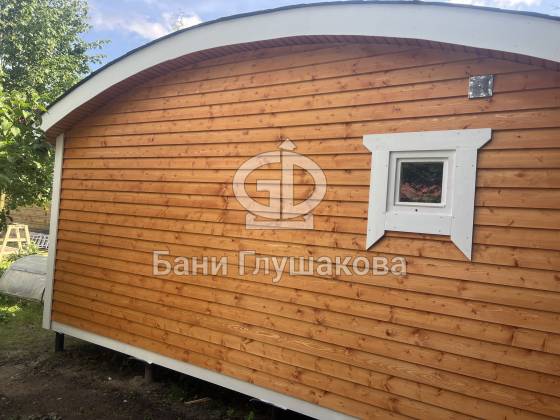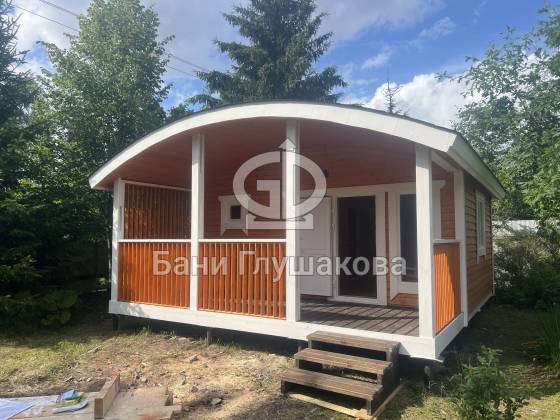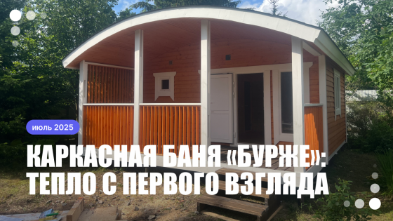 Построили каркасную баню по проекту «Бурже» — и получилась настоящая рыжая красавица. Округлая крыша, белая обводка, аккуратные перила террасы — баня выглядит почти игрушечной, но внутри всё по-взрослому: удобная планировка, надёжные материалы, грамотная вентиляция и мощная печь.