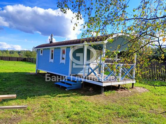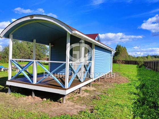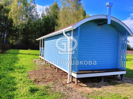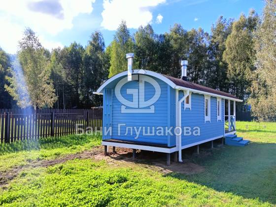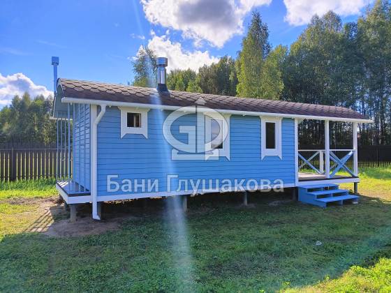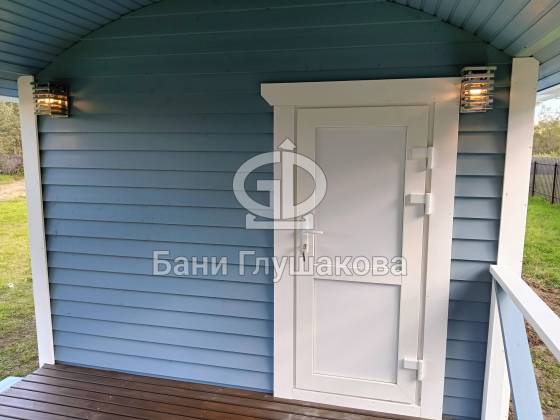 Яркий синий цвет с контрастной белой окантовкой делает баню эффектным украшением участка, а удобная терраса и просторная планировка создают атмосферу уюта и отдыха.
