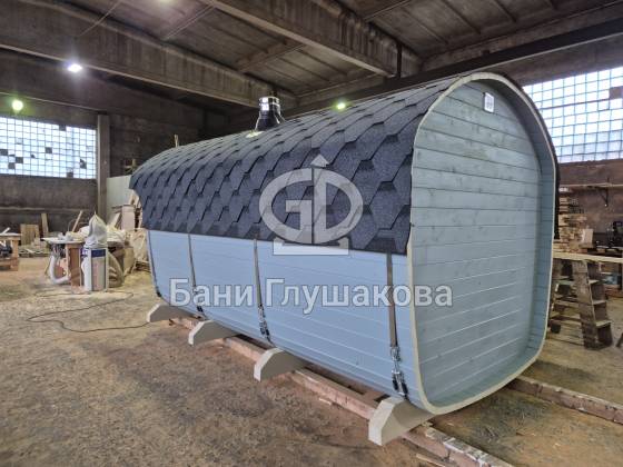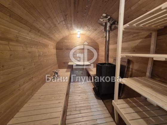 Конструкция выполнена из прочных и долговечных материалов, обеспечивающих тепло и защиту от влаги. За счёт округлой формы, характерной для бани-бочки, помещение выглядит аккуратно и современно, а внутри сохраняется уют и комфорт.