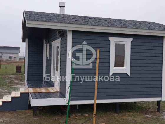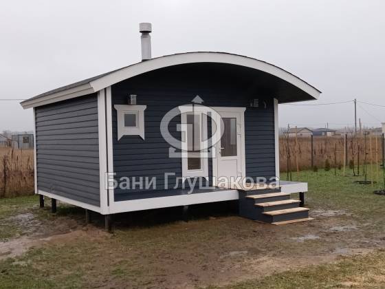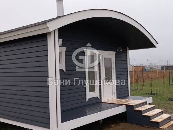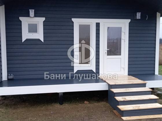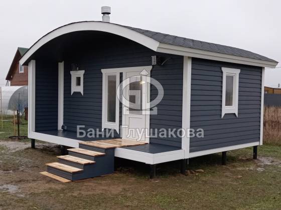Глубокий тёмно-синий оттенок подчёркивает форму, делает баню визуально дорогой и благородной, а белая окантовка добавляет аккуратности и чистоты линий. Вечером, когда включается мягкий свет, баня будто растворяется в сумерках и выглядит особенно уютно — точно маленький домик, где всегда тепло и спокойно.