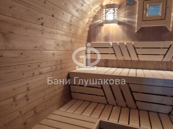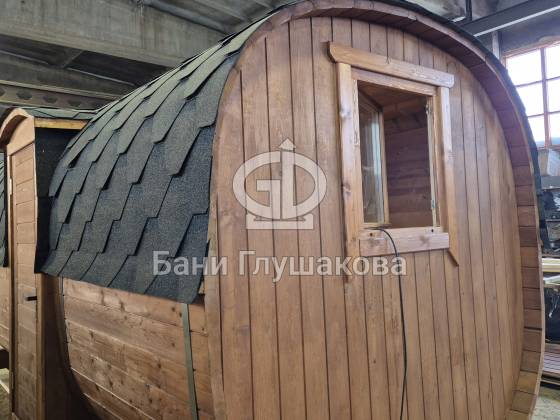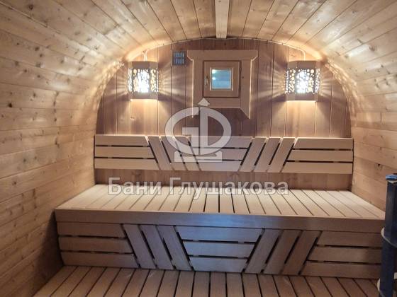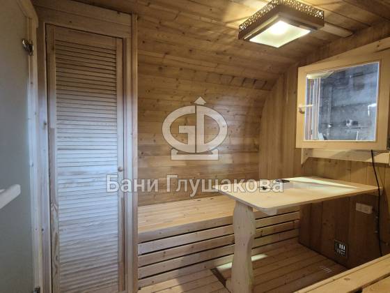 Квадратное сечение (квадро) дает заметно больше внутреннего объема и высоты потолков по сравнению с классическим кругом, поэтому внутри дышится легко и места хватает всем. Баня уже укомплектована фирменной печью, баком для воды и удобными полками — всё готово к первой протопке сразу после установки на участке.
