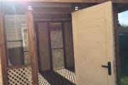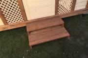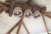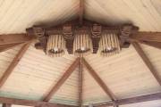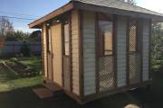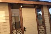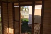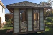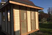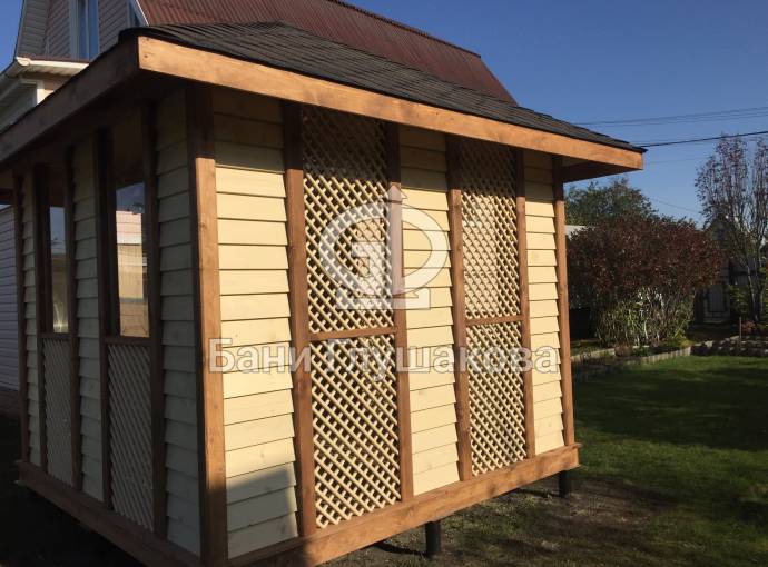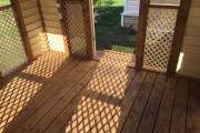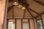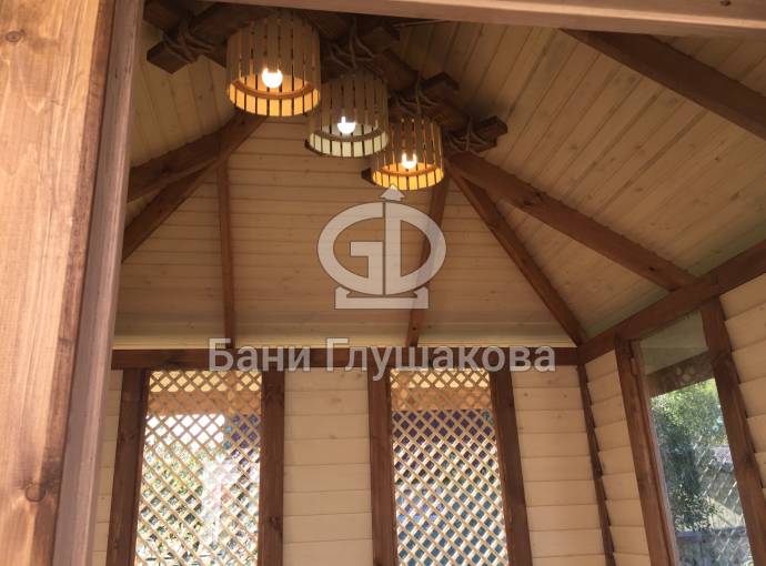 Примечательна и внешняя отделка: беседка обшита сухой строганной доской внахлёст «ёлочкой». До сборки доски красятся защитным составом. Цвет «Ваниль» и обводка «Орех» Акватекс.