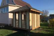Проект небольшой изящной беседки из дерева закрытого типа. Беседка оснащена съёмным остеклением. На вход поставлена надёжная деревянная дверь под ключ.
