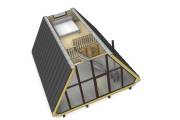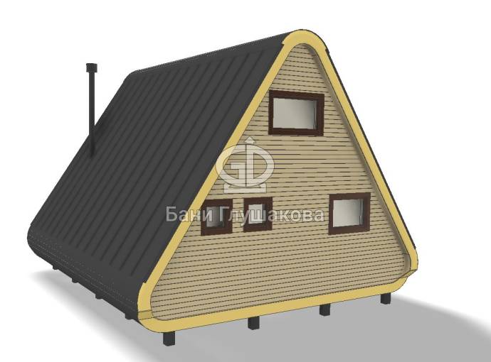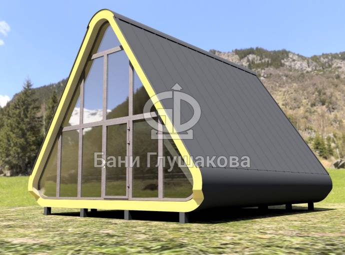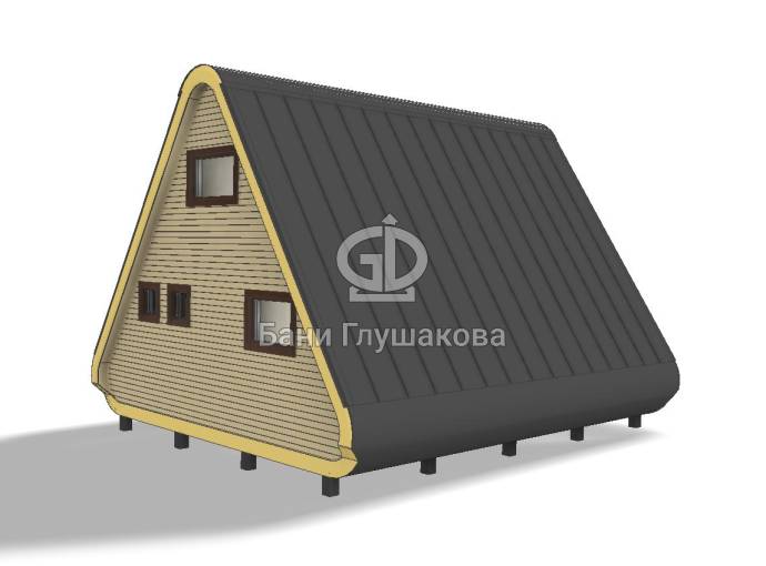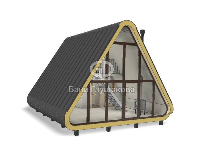 «Айсберг» — это проект каркасной бани с лофтом (верхним уровнем со спальным местом) и шикарным панорамным остеклением.