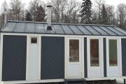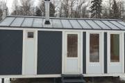 Наружная отделка сочетает в себе деревянные и металлические элементы. Деревянные досочки на лицевом и заднем фасадах расположены наискосок, на боковых стенах — горизонтально.
