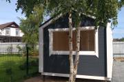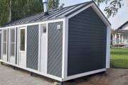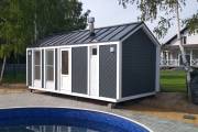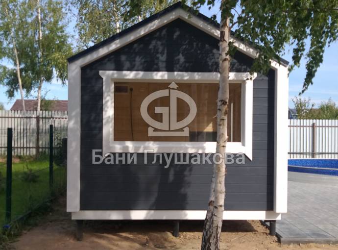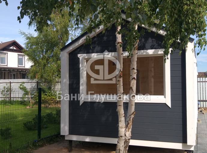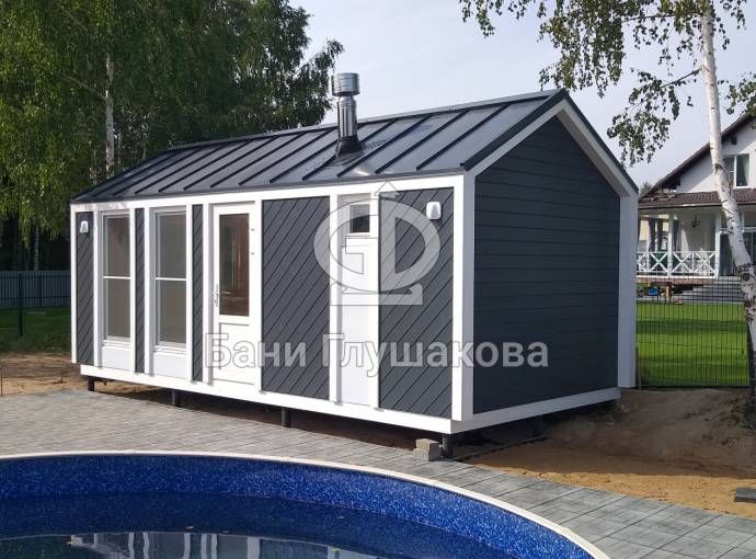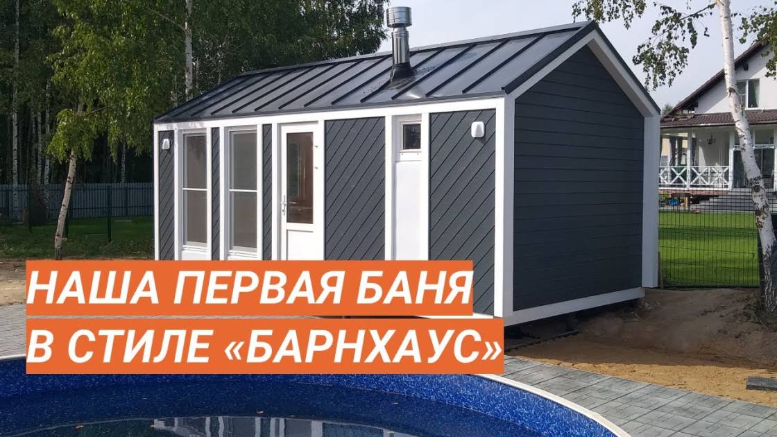 Современная каркасная баня по проекту «Барнхаус» под ключ с полной отделкой снаружи и внутри. Это стационарный вариант со сборкой на участке. Размер бани по наружному контуру 3 на 6 метров.