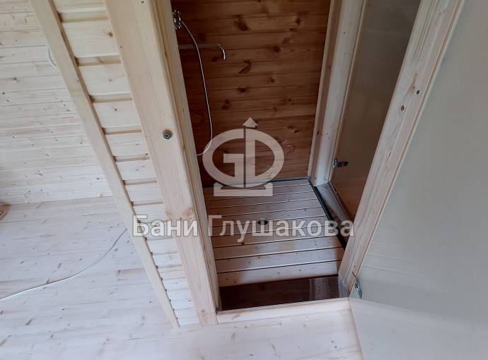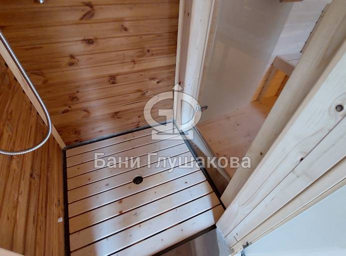 Установлен в помывочном отделении пластиковый герметичный поддон с сифоном для слива воды, в него вложен деревянный трапик (в планировках, где подразумевается душевое помещение). Ссылка на фото и видео
