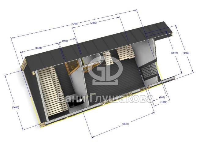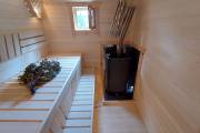 Внутри 3 помещения: комната отдыха, душ и парная. Всё с полной отделкой под ключ.