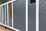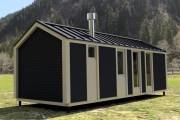 Сборка выполнена по каркасной технологии. Наружная отделка планкеном и сухой доской — такое сочетание позволяет добиться эффектного «амбарного» вида.