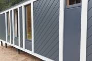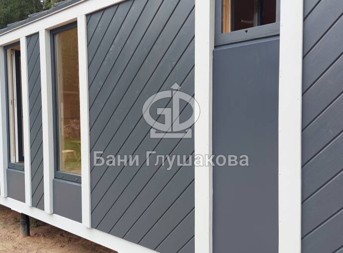 Сухая, строганная, покрашенная и только потом установленная доска внахлест одна на другую, (если это баня «Барн», то обшивается имитацией бруса), если баня «Кубота», то планкеном.