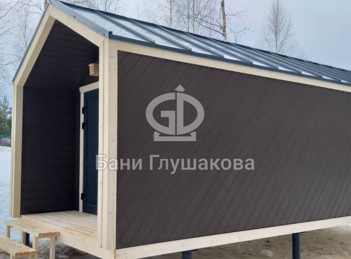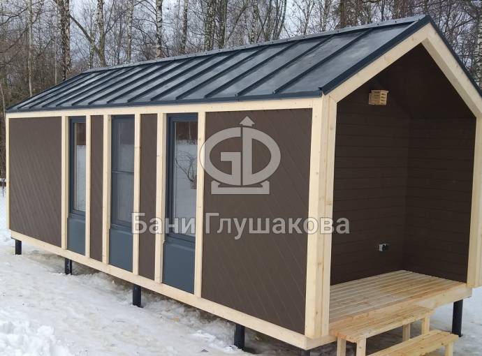 Бытовку можно оснастить террасой или же отказаться от неё, тем самым увеличив внутреннюю площадь помещения.