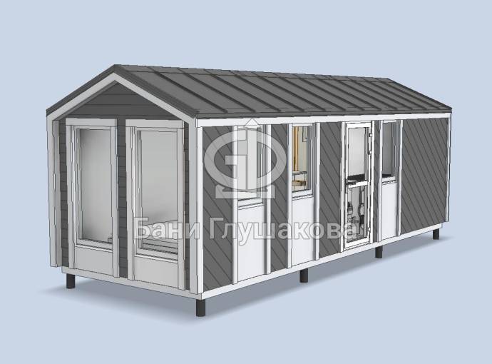 Изготавливается по каркасной технологии. В наружной отделке используются деревянные и металлические элементы.