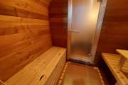 Установлены металлические комплектующие из нержавейки: вентиляционные клапаны-задвижки, крепления для проводки, наличник на форточку и порожек между помещениями. Ступеньки тоже уже входят в стоимость. Замечательная расстановка в парной: широкие полки поставлены углом, а печь сбоку. Поверьте нашему многолетнему опыту — это и правда самый удобный вариант.