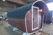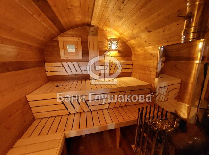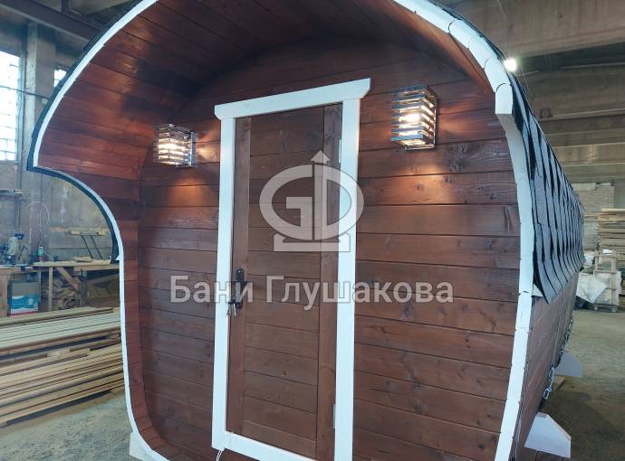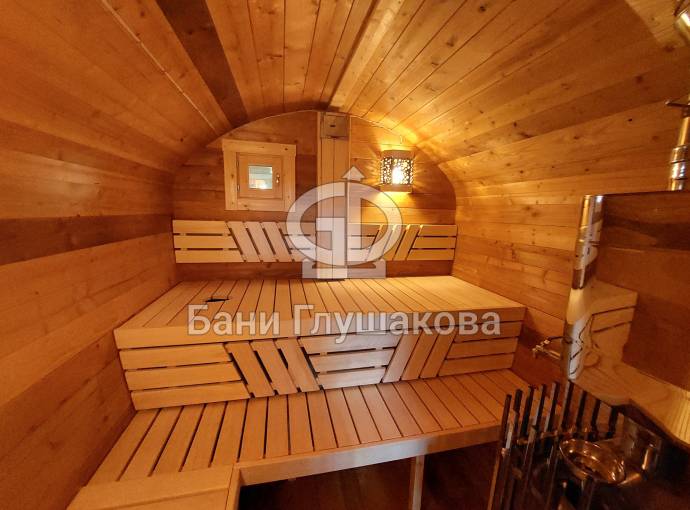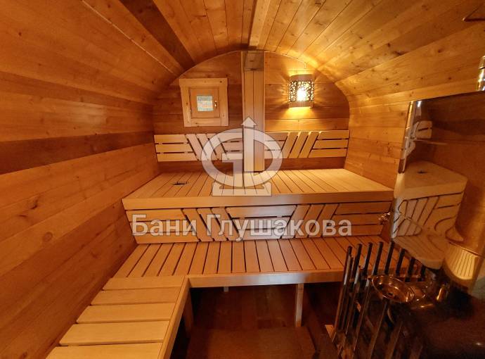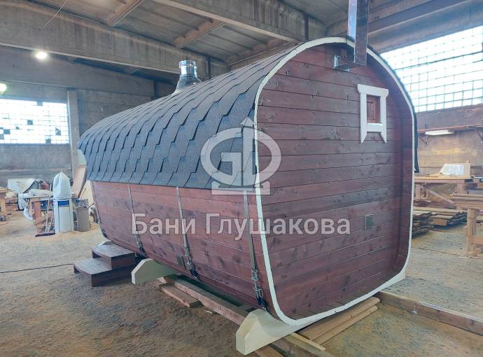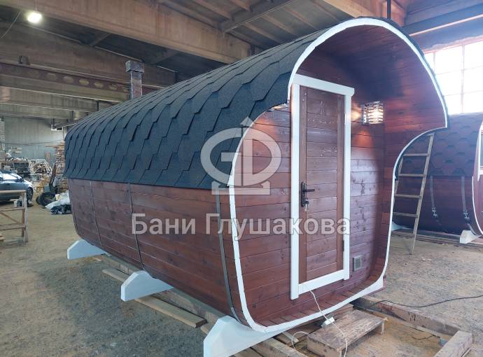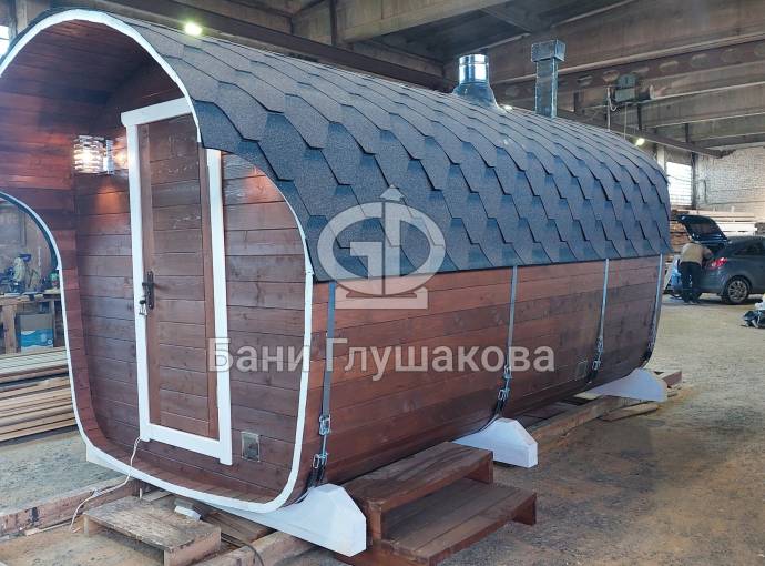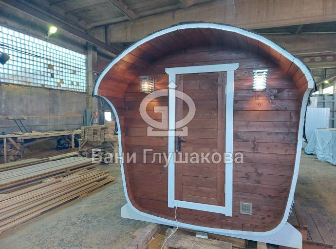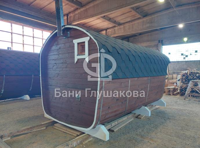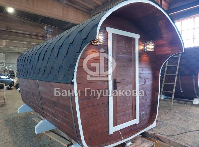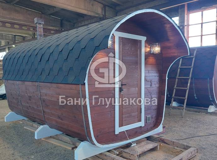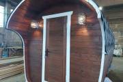 Баня имеет необычную оригинальную форму – на наш взгляд, она удобнее и симпатичнее квадратной или круглой бочки.