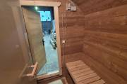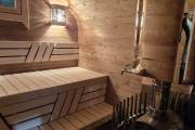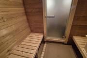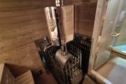 Установлены металлические комплектующие из нержавейки: вентиляционные клапаны-задвижки, крепления для проводки, наличник на форточку и порожек между помещениями. Ступеньки тоже уже входят в стоимость. Замечательная расстановка в парной: широкие полки поставлены углом, а печь сбоку. Поверьте нашему многолетнему опыту — это и правда самый удобный вариант.
