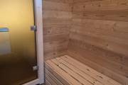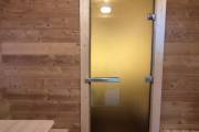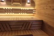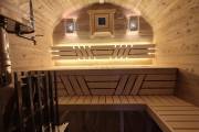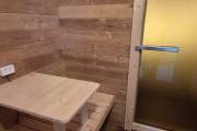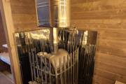 Установлены металлические комплектующие из нержавейки: вентиляционные клапаны-задвижки, крепления для проводки, наличник на форточку и порожек между помещениями. Ступеньки тоже уже входят в стоимость. Замечательная расстановка в парной: широкие полки поставлены углом, а печь сбоку. Поверьте нашему многолетнему опыту — это и правда самый удобный вариант.