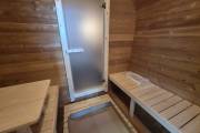 Баня сделана из отсортированной термодоски — мы отобрали хорошее дерево, но с небольшими косметическими изъянами. Ничего критичного, просто живой материал с характером.