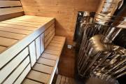 Установлены металлические комплектующие из нержавейки: вентиляционные клапаны-задвижки, крепления для проводки, наличник на форточку и порожек между помещениями. Ступеньки тоже уже входят в стоимость. Замечательная расстановка в парной: широкие полки поставлены углом, а печь сбоку. Поверьте нашему многолетнему опыту — это и правда самый удобный вариант.