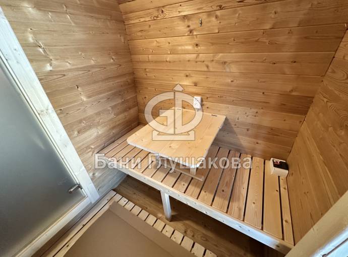 Баня изготавливается из термодоски. Размер 2,4 на 4 метра, внутри 2 помещения: комната отдыха и парная.