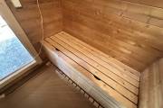 Установлены металлические комплектующие из нержавейки: вентиляционные клапаны-задвижки, крепления для проводки, наличник на форточку и порожек между помещениями. Ступеньки тоже уже входят в стоимость. Замечательная расстановка в парной: широкие полки поставлены углом, а печь сбоку. Поверьте нашему многолетнему опыту — это и правда самый удобный вариант.