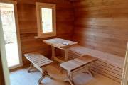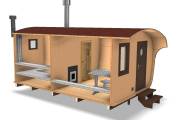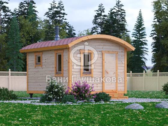 Мы предлагаем строительство этой бани из термомодифицированной доски. Потому что подозреваем, что обычная бочковая доска не подойдёт из-за размера бани: при набухании будут образовываться щели. Термодоска предупредит эту неприятность.