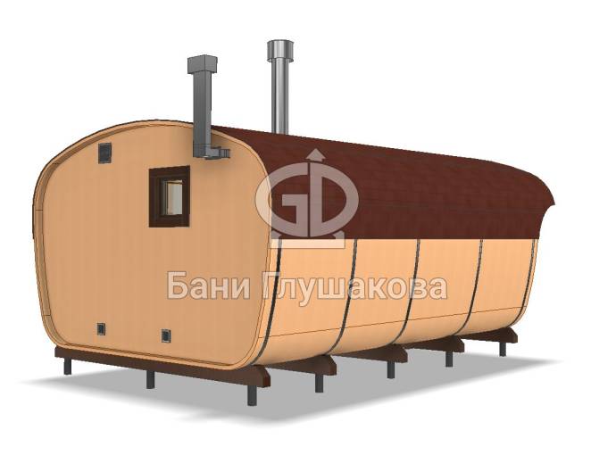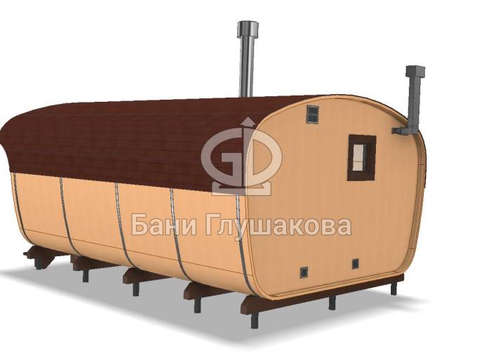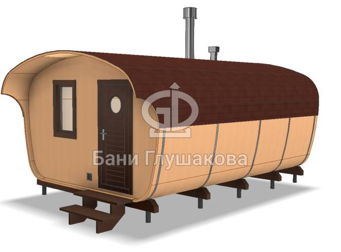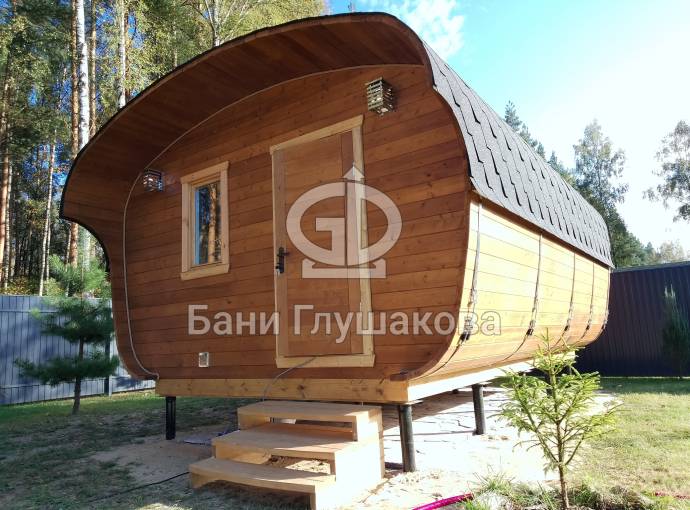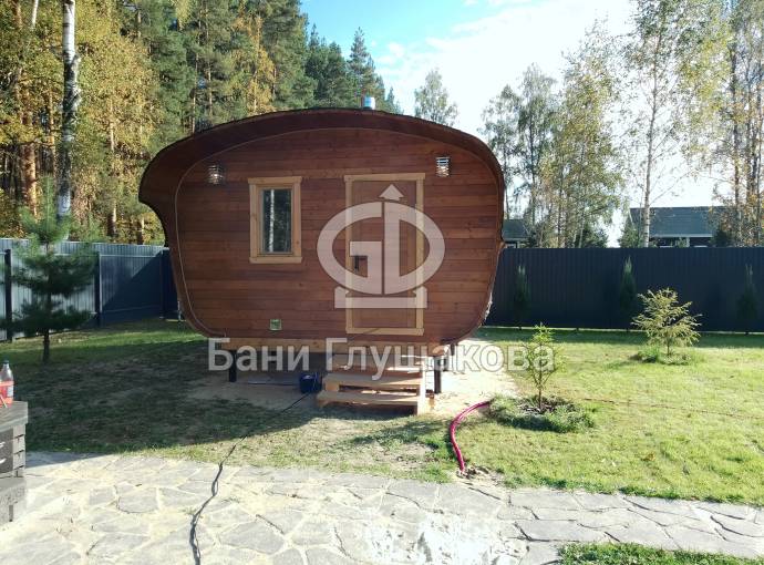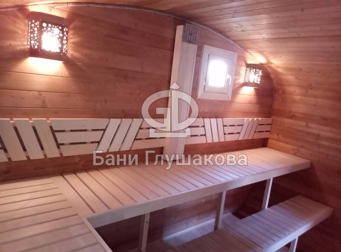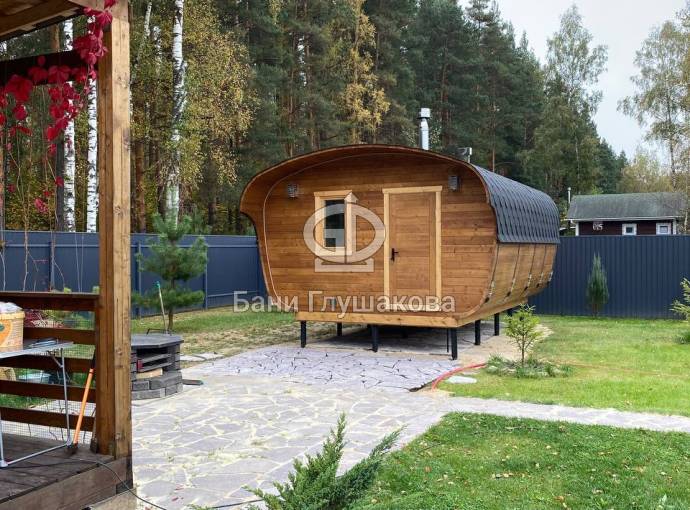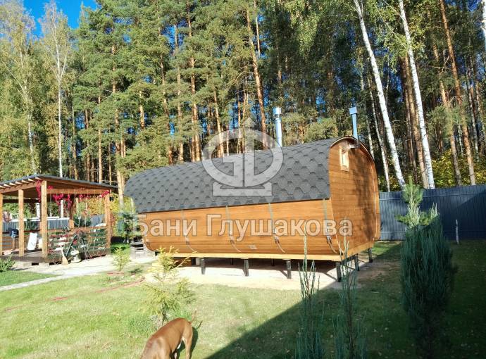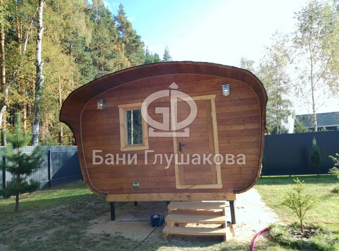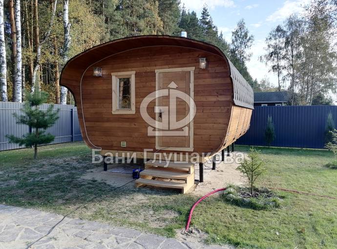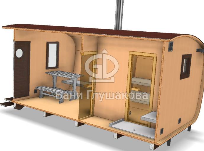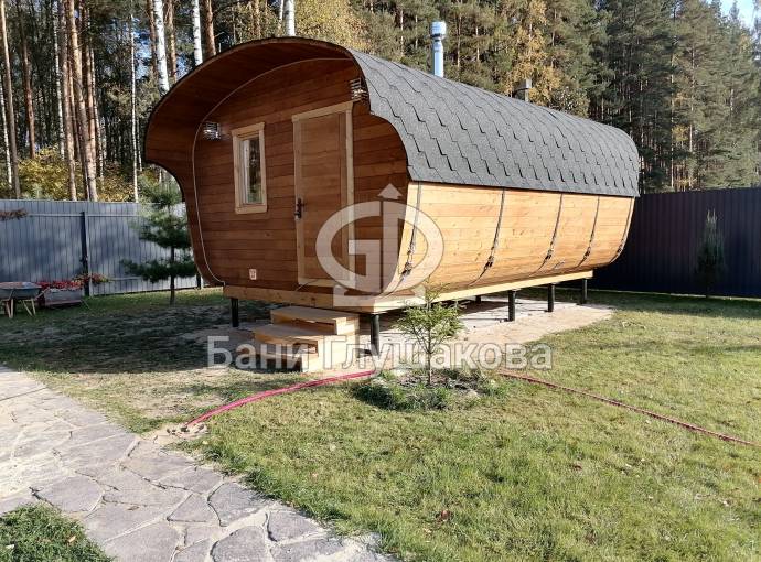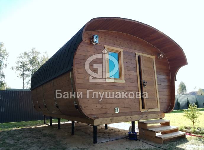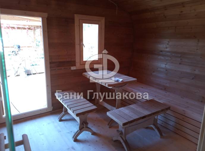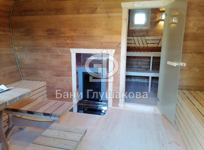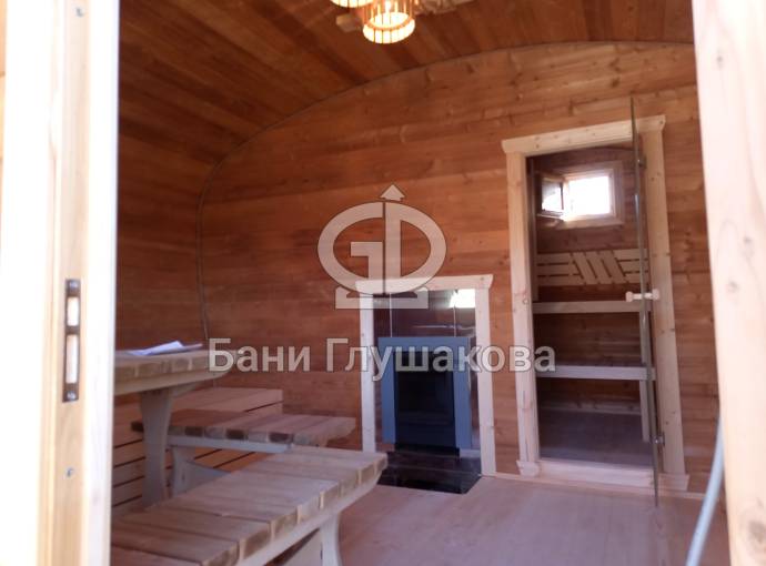 Это принципиально новая вариация бани бочки в нашем ассортименте. Проект на стыке круглой бани и бани «Танк». Размер 4 на 6 метров — довольно большая. Внутреннее пространство разделено на комнату отдыха, парную, душевое помещение и небольшой закуточек для душевой системы. Каждый сантиметр площади стремимся использовать рационально.