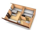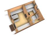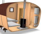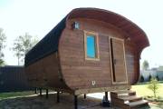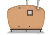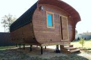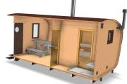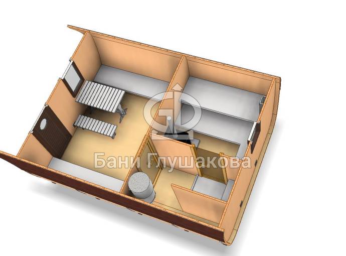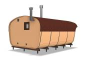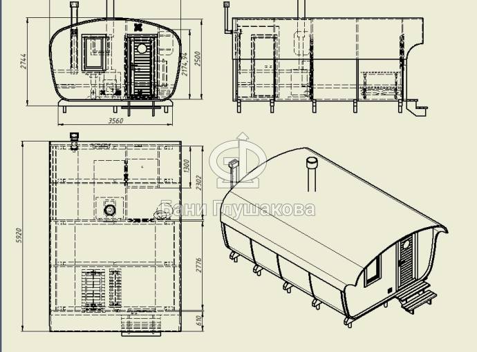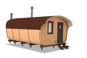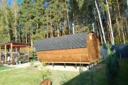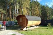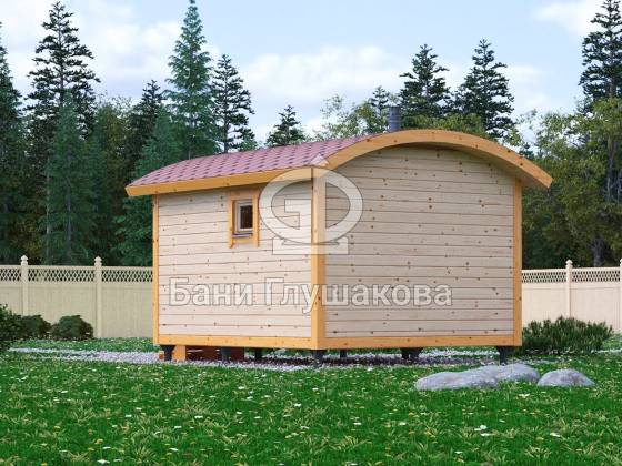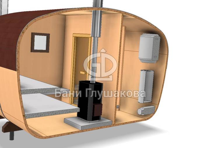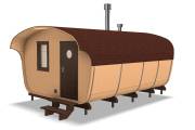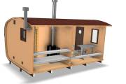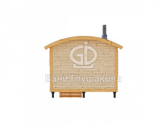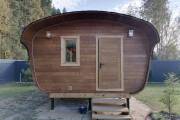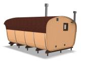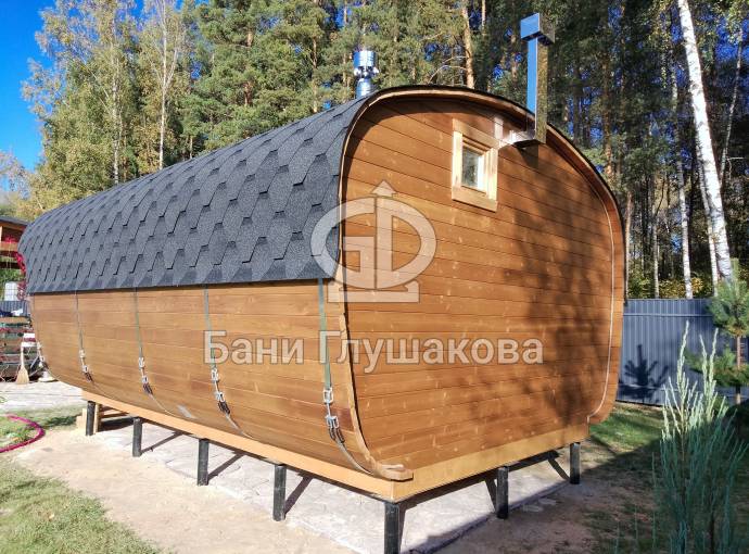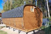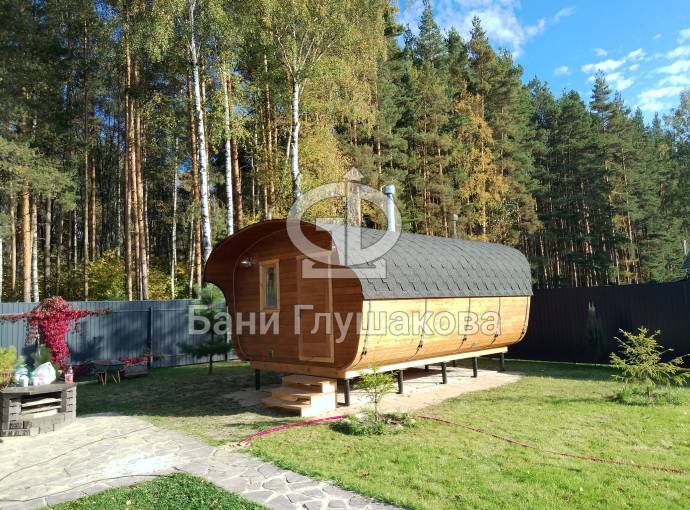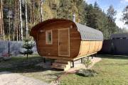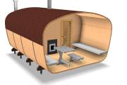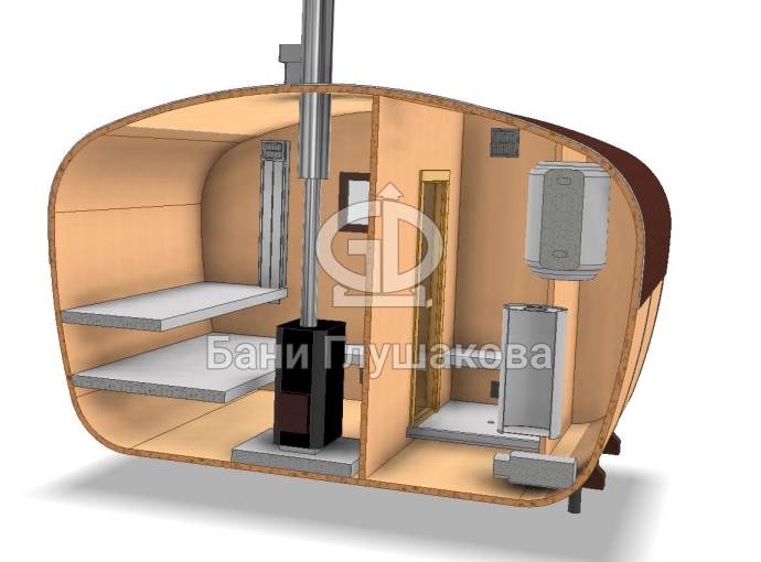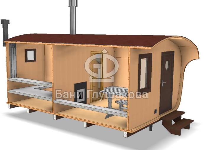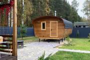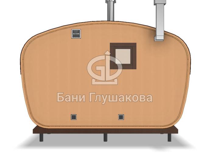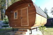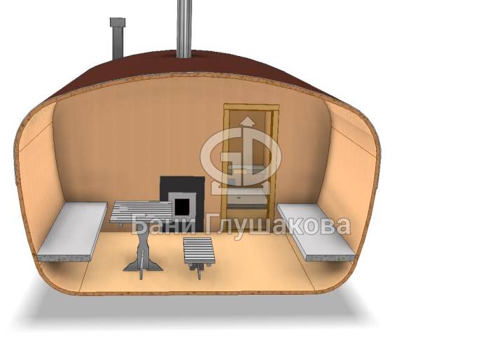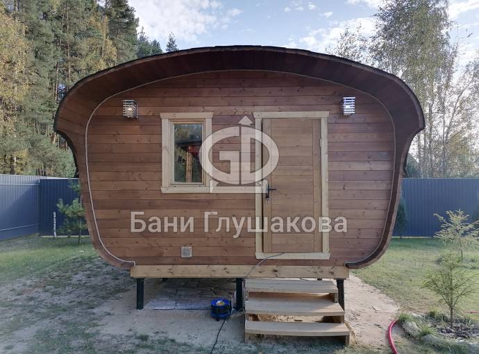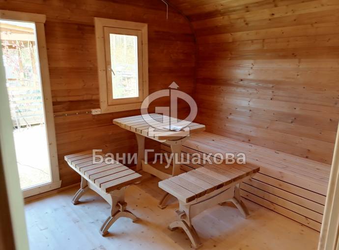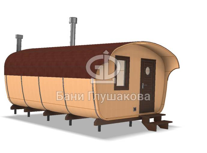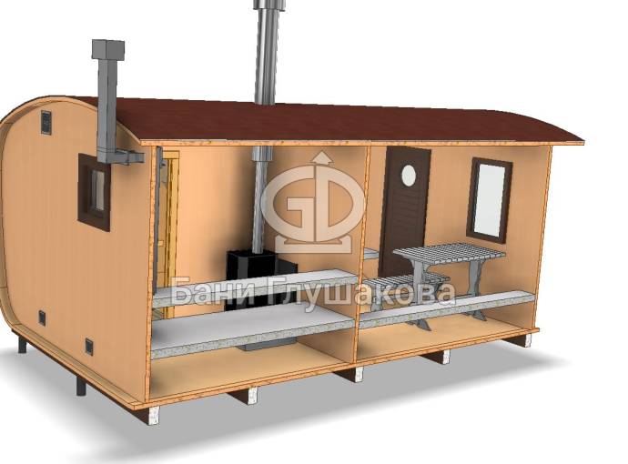 Это принципиально новая вариация бани бочки в нашем ассортименте. Проект на стыке круглой бани и бани «Танк». Размер 4 на 6 метров — довольно большая. Внутреннее пространство разделено на комнату отдыха, парную, душевое помещение и небольшой закуточек для душевой системы. Каждый сантиметр площади стремимся использовать рационально.