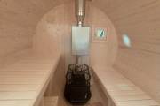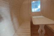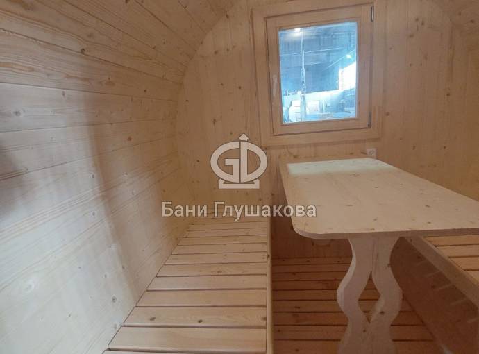 Всё сделано аккуратно и красиво. В парной стоит отличная печь Бочонок Компакт с парогенератором и два разноуровневых полка. В комнате отдыха столик и две скамейки. На входе стоит наша фирменная округлая «Корабельная» дверь.