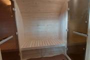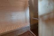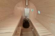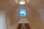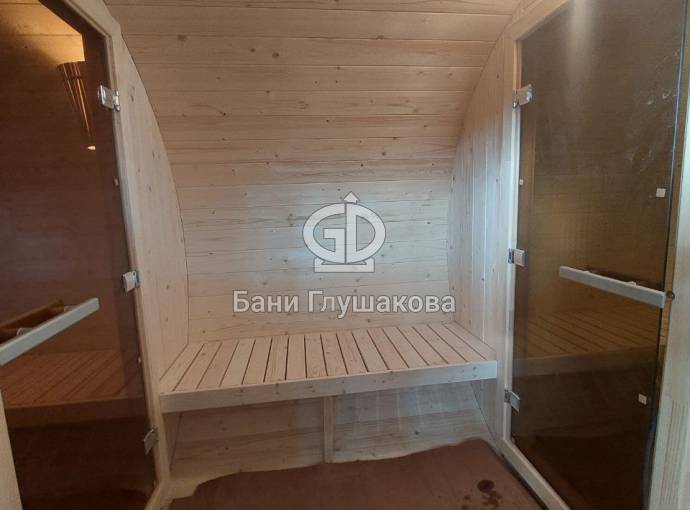 Размер 2,2 на 5,9 метров. Внутри 3 отделения: предбанник, комната отдыха и парная.