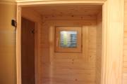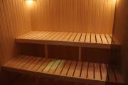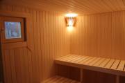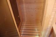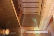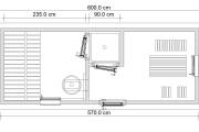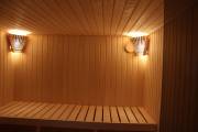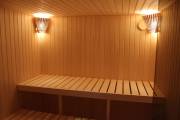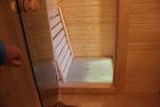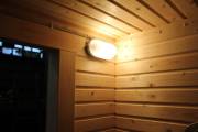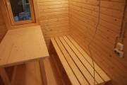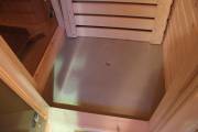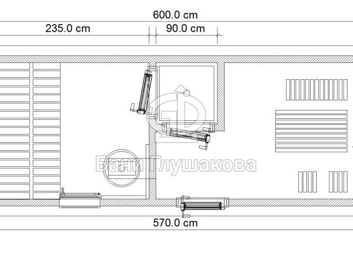 Длина составляет 6 метров — максимально возможный размер для мобильной бани. На площади 12,5 кв.м. три помещения: комната отдыха, душевая кабина, парилка. Это первая баня, в которой реализовано очень красивое освещение сауны — по углам и под полками.