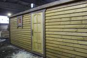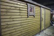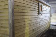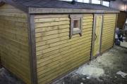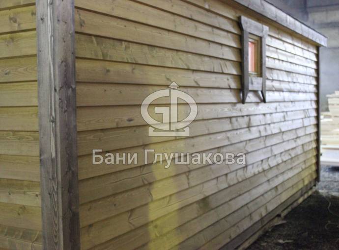 Баня изготавливается на производстве — внутренняя и внешняя отделка, кровля, наличники, окна-двери, душевое и печное оборудование, — на участок привозится в уже полностью укомплектованном и собранном виде. Установка производится на заранее подготовленное место (фундамент заказывается отдельно). Цвет бани — любой.