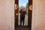 Фасад и задняя стена бани оснащены симметрично расположенными круглыми окнами, что обеспечивает проникновение дневного света.