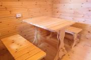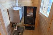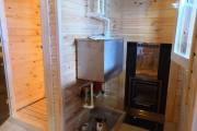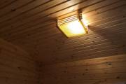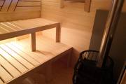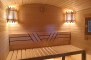 В парной установлены двухуровневые полки. Нижний ярус удлинён — очень удобно для хранения тазиков. Также сделана красивая спинка. В углах установлены декоративные светильники. Также есть подсветка полков. Есть вентиляция. Печь стоит сбоку, топка выведена в комнату отдыха. Дверца с панорамным стеклом.