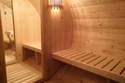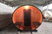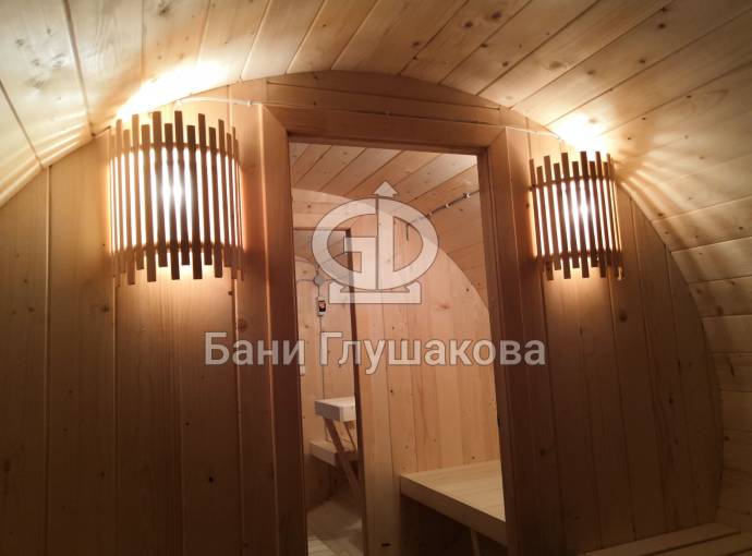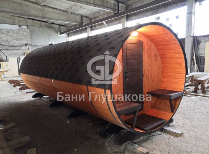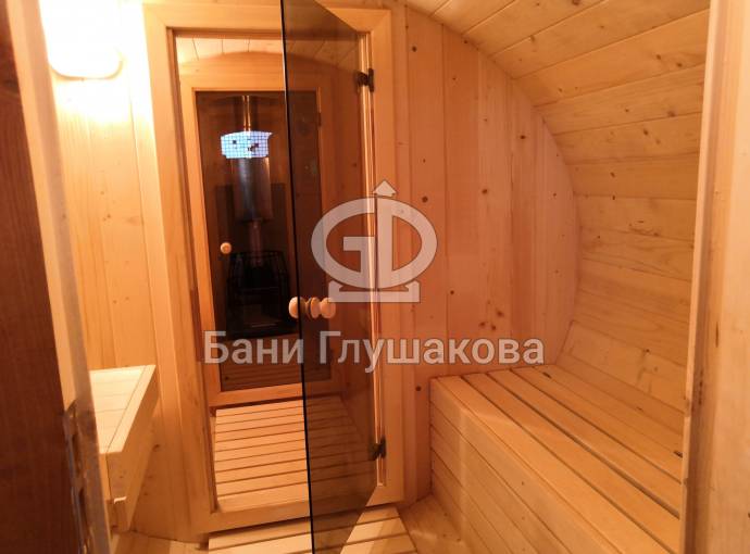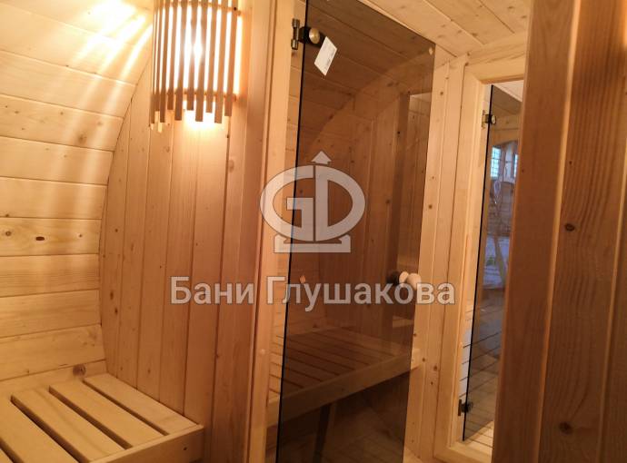 Эта баня построена по проекту овальной бани бочки «Финская». Образец находится на выставочной площадке в Санкт-Петербурге по адресу: г. С.-Петербург, Мурманское ш. 1, 12-ый км, ТЦ МЕГА на Дыбенко.
