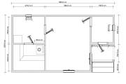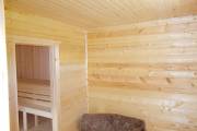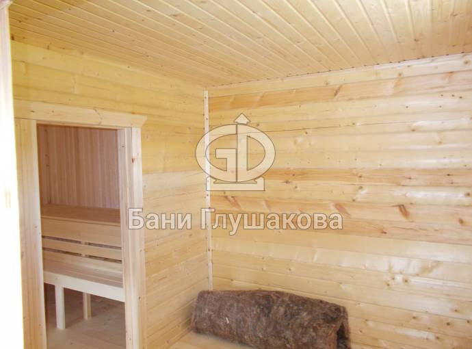 В помывочном отделении сделан душевой поддон на полу, со сливным отверстием, деревянными трапиками