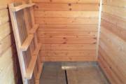 В помывочном отделении сделан душевой поддон на полу, со сливным отверстием, деревянными трапиками