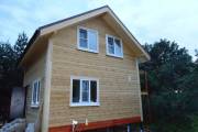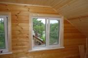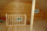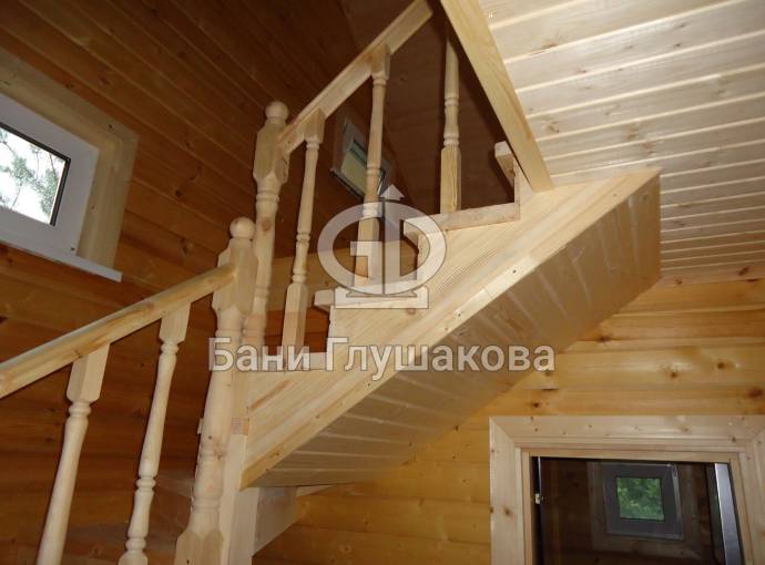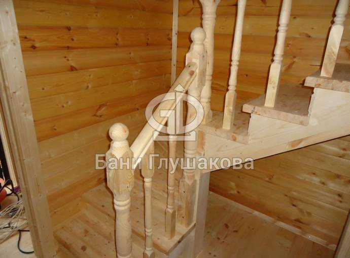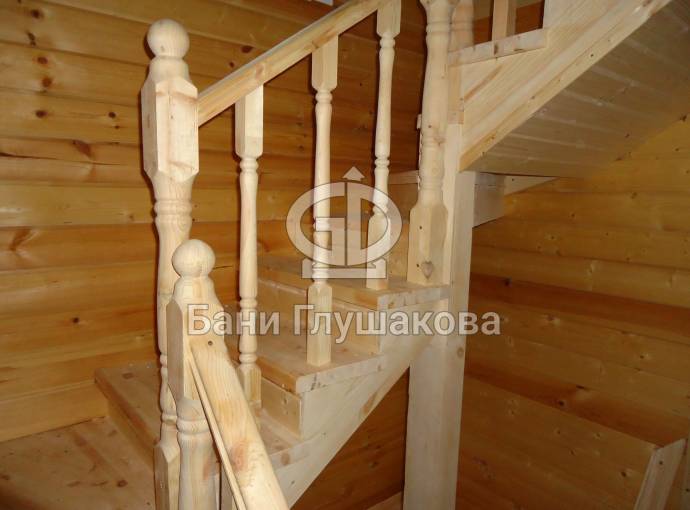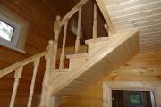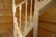 Если объект двухэтажный, то изготавливаем лестницу из строганного бруса. Ступени из специальной клееной доски. Перила настоящие, круглые с точеными балясинами (страница с фото наших работ с лестницами).