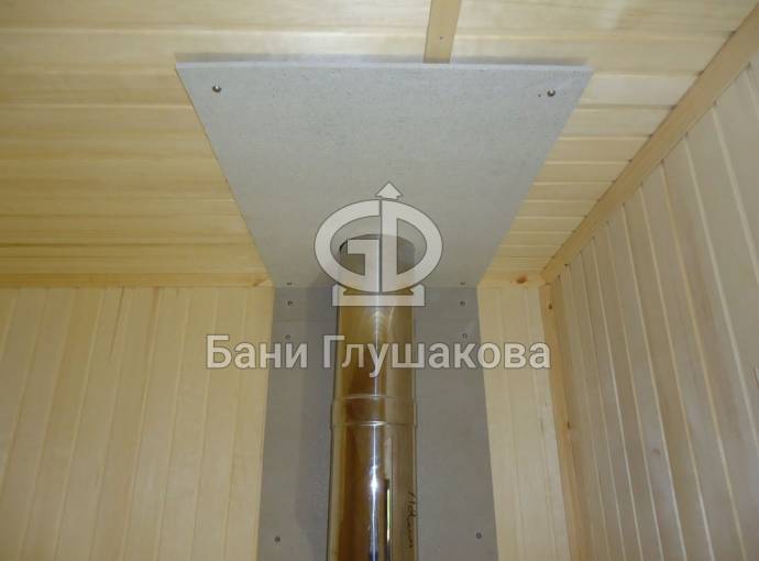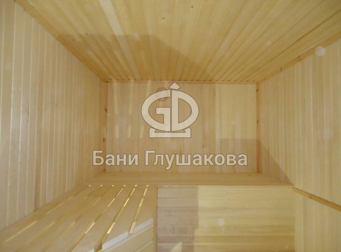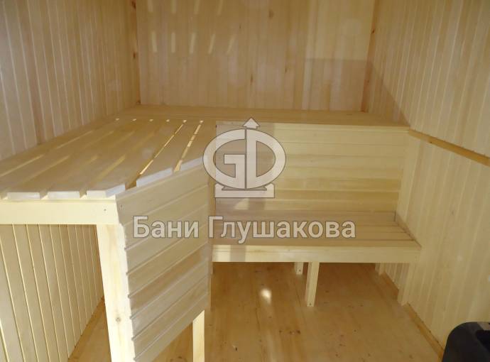 В помывочном отделении сделан душевой поддон на полу, со сливным отверстием, деревянными трапиками