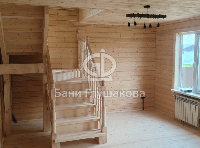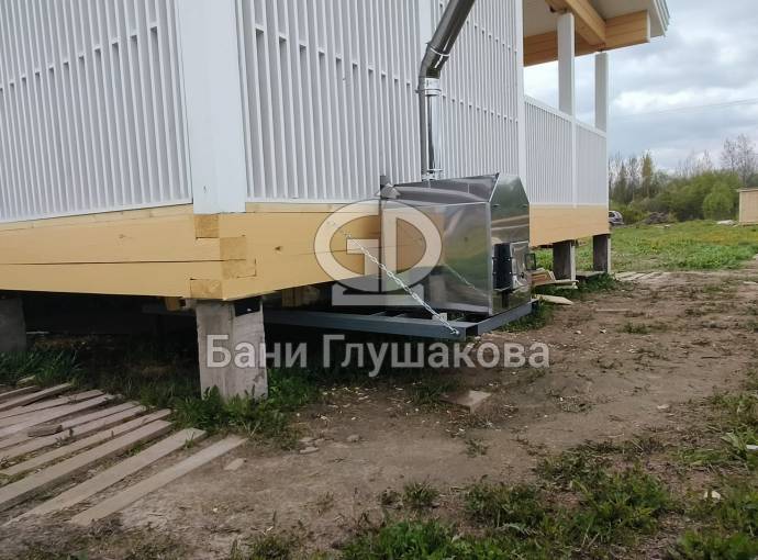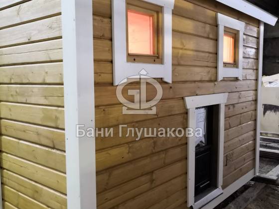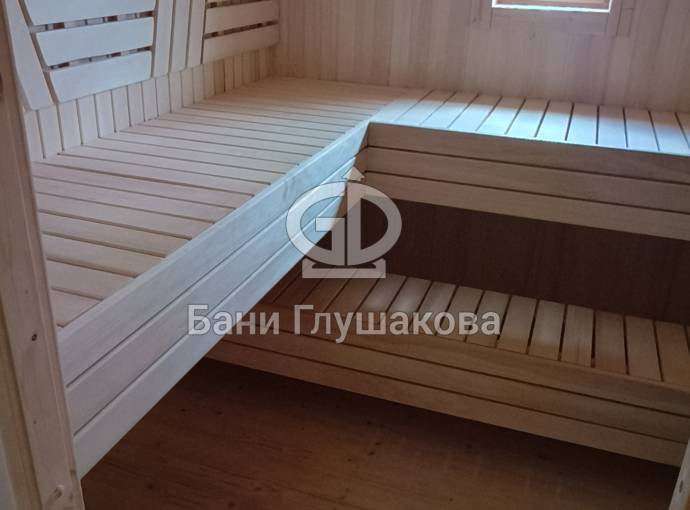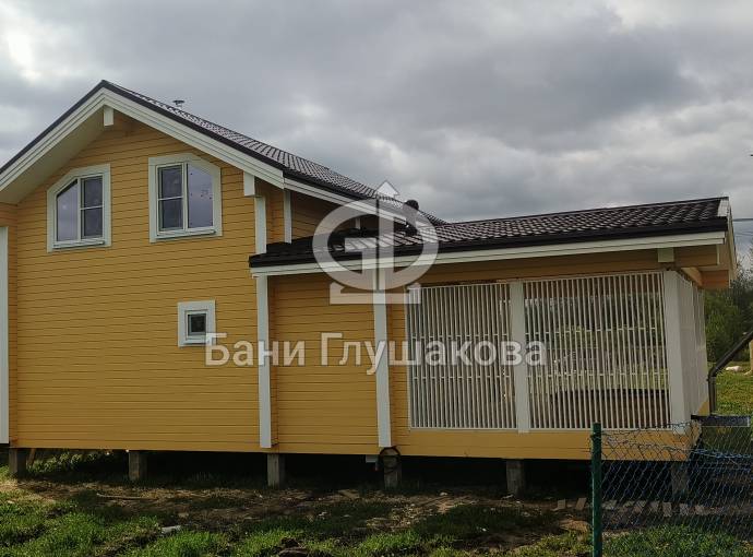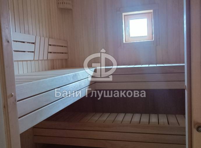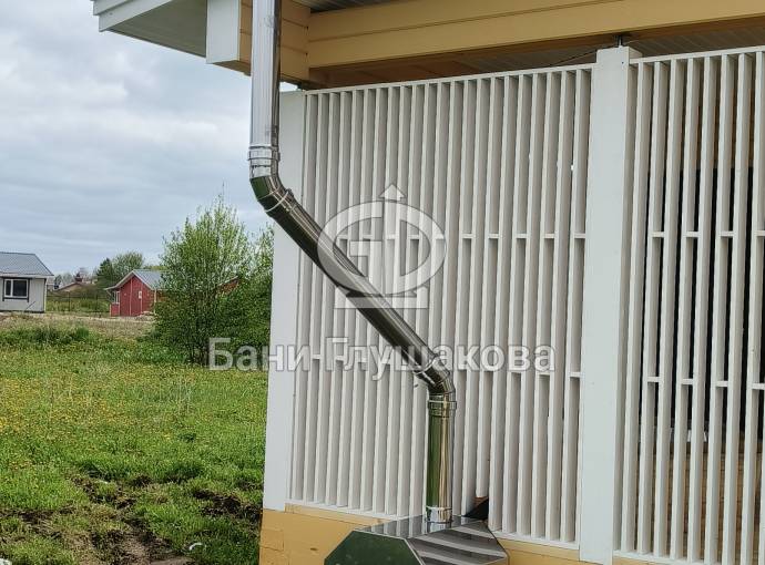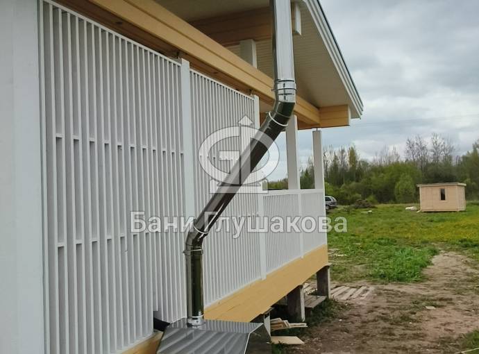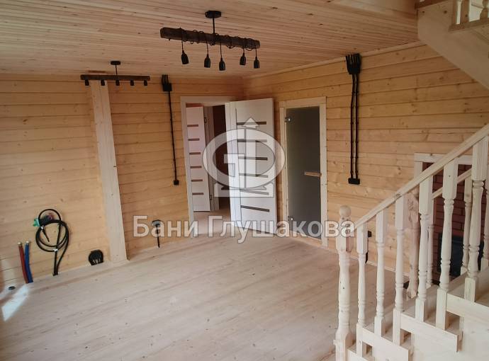 Баня построена из клеёного бруса 190×140 мм — прочного, долговечного материала с минимальной усадкой. По желанию клиента возможны варианты из сухого профилированного бруса или по каркасной технологии.