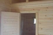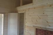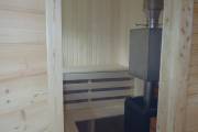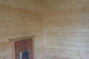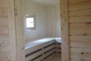 Для строительства был выбран брус камерной сушки 140х140 с улучшенным финским профилем. Он имеет наплыв 2 см по бокам, что позволяет делать соединение венцов с перекрытием. То есть шип-паз с утеплителем упакованы очень герметично, вода туда не попадёт. И даже если в процессе усадки брус немного деформируется, то межвенцовые щели всё равно не появятся — проверено на сотне бань. Баня исполнена в классическом варианте — комната отдыха (сюда выведена печная топка со стеклянной дверцей — получается такой мини-камин), парная с каменкой и помывочное помещение, куда, кстати, можно установить душевую систему. Смотрите, как работает душ в наших банях.