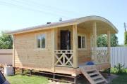 Перед вами проект небольшой стационарной бани 4х6 с необычной округлой крышей и маленькой террасой. Модель на фотографии выполнена из клееного кедрового профилированного бруса высочайшего качества. Это топовый деревянный материал. Если бы у нас спросили: «Из какого бруса рекомендуете строить, если нет ограничений по бюджету?», — мы бы ответили, что лучше клееного проф.бруса из кедра мы ничего не видели. И это сущая правда.